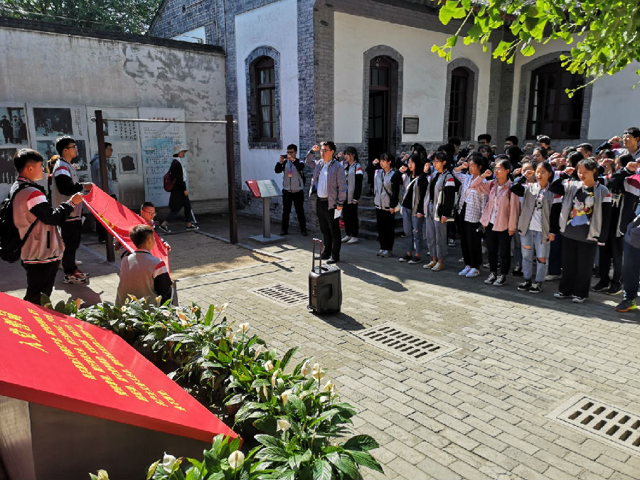 在校歌《輝煌明天》的激昂旋律中,歷時(shí)一個(gè)多小時(shí)到達(dá)了八路軍辦事處紀(jì)念館。在參觀前,同學(xué)們集體奏唱國(guó)歌,然后,張嘉豪同學(xué)與李渲同學(xué)獻(xiàn)上了深情的朗誦來(lái)表達(dá)自己對(duì)革命先烈的無(wú)限敬仰之情,最后梁琦老師帶領(lǐng)同學(xué)們莊嚴(yán)宣誓,并叮囑同學(xué)們注意自身安全的同時(shí),希望各位學(xué)員能夠沿著紅色足跡重走信仰之路,銘記光輝歷史、傳承紅色基因。
