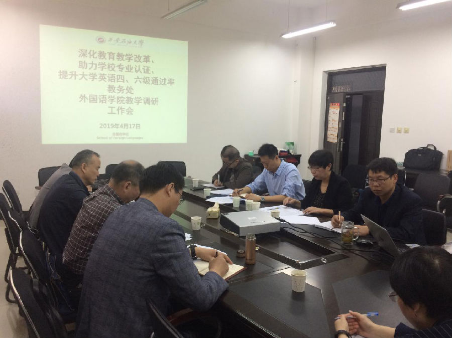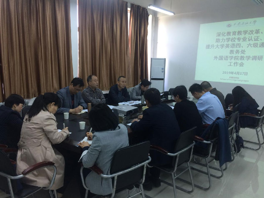 外國語學院大學英語教學部主任、課程組負責人及教師代表紛紛圍繞深化大學英語教學改革,提升大學英語四、六級通過率,配合學校專業(yè)認證等方面問題積極發(fā)言,獻言獻策,并與調(diào)研領(lǐng)導進行了深入的探討和交流。