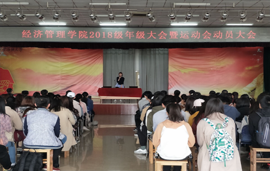 2019年4月16日中午,經濟管理學院2018級年級大會暨運動會動員大會在騰輝大學生活動中心召開。院黨委副書記趙海濤老師,2018級輔導員尹曉嬌老師、陸曉寒老師及2018級全體同學參加本次大會。