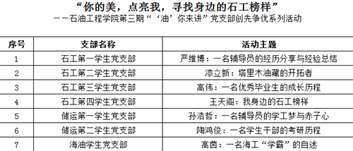 為全面學(xué)習(xí)貫徹黨的十九大精神,深入貫徹落實(shí)習(xí)近平新時代中國特色社會主義思想,按照新時代黨的建設(shè)的總要求,推動全面從嚴(yán)治黨向基層延伸,進(jìn)一步增強(qiáng)支部書記抓好黨建工作的責(zé)任意識,激發(fā)基層黨支部活力,切實(shí)提高學(xué)院黨建工作質(zhì)量,石油工程學(xué)院組織開展了“‘油’你來講”——學(xué)生黨支部創(chuàng)先爭優(yōu)活動,目前進(jìn)行到第三期。