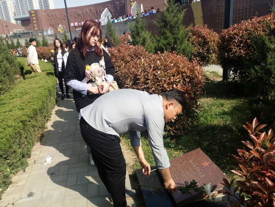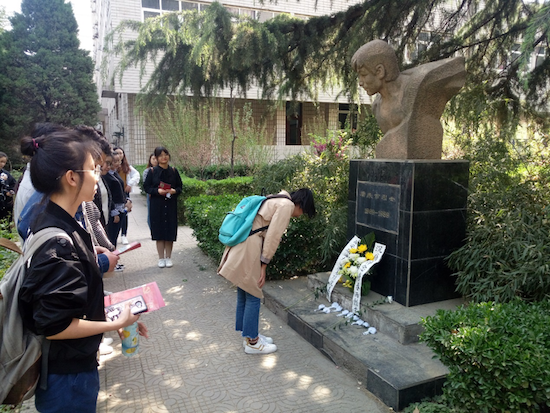 離開(kāi)烈士陵園后,大家步行至我校雁塔校區(qū),在烈士唐春雨的雕像前,行鞠躬禮,以表達(dá)崇敬和懷念之情。