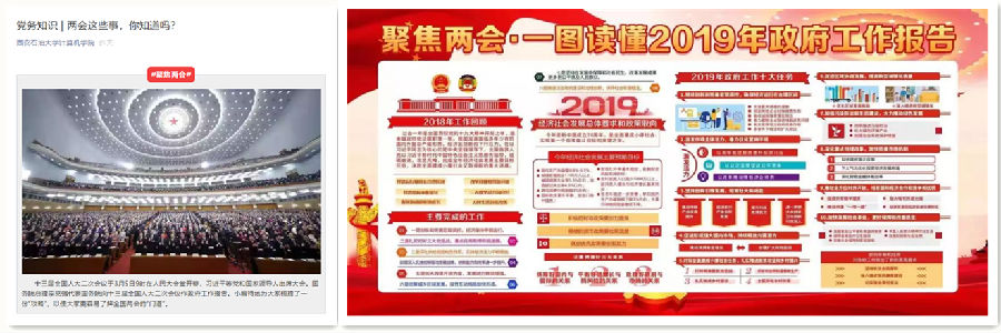 積極關(guān)注“兩會”動態(tài),加強“兩會”知識宣傳。學(xué)院依托“西油計”微信公眾號、微信群、QQ群和展板等多種平臺,集中開展“‘兩會’那些事兒”、“一圖看懂2019年政府工作報告”等知識點宣傳,實現(xiàn)宣傳進教研室、進年級、進支部、進班級、進宿舍。