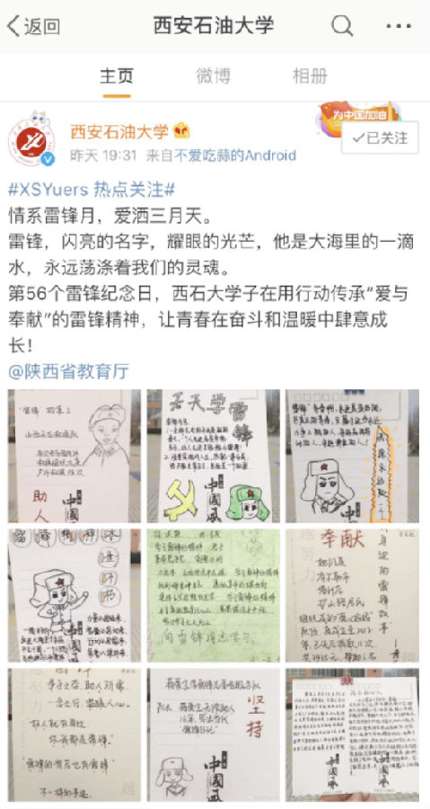 活動伊始,學生干部們在老食堂門口布置展示了雷鋒肖像和雷鋒生平故事,其積極姿態(tài)吸引了眾多同學觀看參與。學生干部們?yōu)橥瑢W們詳細講解了雷鋒生平事跡和雷鋒精神。隨后,部門成員們開始了“校園清潔活動”,大家分成了若干小組分散到學校的各個角落進行清潔活動。在活動成員們的渲染下,許多同學也投入到清潔行列。雷鋒精神時刻被提倡著,我們應(yīng)該讓雷鋒精神成為一種生活中的一部分,從小事做起,從身邊做起,使更多需要幫助的人得到幫助,讓我們的校園變得更美好。
