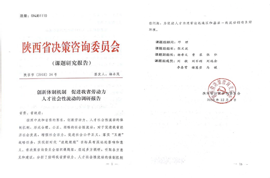 為此,陜西省決策咨詢委員會(huì)專(zhuān)門(mén)組織課題組進(jìn)行了專(zhuān)題研究。經(jīng)過(guò)長(zhǎng)達(dá)半年時(shí)間,多方調(diào)研,聽(tīng)取各方意見(jiàn)和建議,數(shù)次修改,由我校經(jīng)管院劉毅博士主筆,李春霄博士參與撰寫(xiě)的《創(chuàng)新體制機(jī)制 促進(jìn)我省勞動(dòng)力人才社會(huì)性流動(dòng)的調(diào)研報(bào)告》,由陜西省決策咨詢委員會(huì)以決策咨詢報(bào)告的形式(陜咨字[2018]34號(hào))報(bào)省委、省政府,得到省委、省政府的重視。