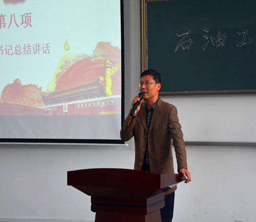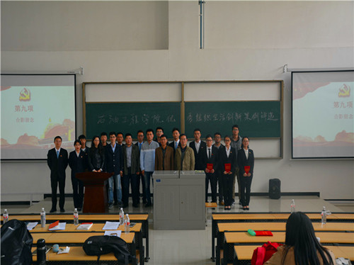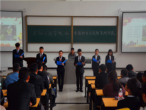 為深入學習貫徹習近平新時代中國特色社會主義思想和黨的十九大精神,落實全國高校思想政治工作會議精神,進一步推進“兩學一做”學習教育常態(tài)化制度化,響應學校要求,推動我院學生黨支部建設,提高學生黨支部組織生活的質量和效果,增強學生黨支部的創(chuàng)造力、凝聚力和戰(zhàn)斗力,石油工程學院黨委于2018年10月24日中午12:30在鄠邑校區(qū)石工地科樓115教室舉行了學生黨支部優(yōu)秀組織生活創(chuàng)新案例評選活動。學院黨委書記馬勇、黨委副書記張建高、黨委組織委員孫會珠、化學化工學院黨委兼職組織員屈敏佳、經(jīng)濟管理學院黨委兼職組織員武威受邀參加并擔任評委,學院全體輔導員及130余名學生黨員也參加了活動。