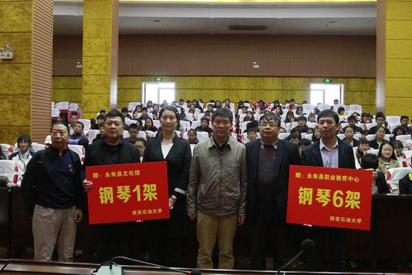 上午10時,捐贈鋼琴儀式在永壽縣職教中心報告廳舉行,西安石油大學工會主席李方、工會副主席朱瑋,永壽縣政府教育督導室副主任黃健身出席了捐贈儀式,受贈單位的負責同志和部分學生代表參加了捐贈儀式。