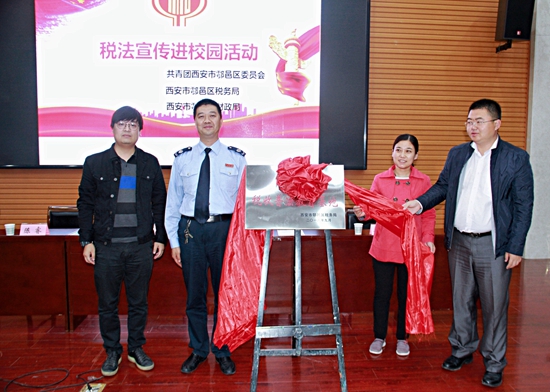 9月18日下午,經濟管理學院書香校園系列活動之稅收普法基地揭牌儀式在經管人文樓118舉行。鄠邑區(qū)團委副書記陳睿,區(qū)稅務局總經濟師徐凱,區(qū)財政局、區(qū)稅務局青春夢之隊成員代表以及經濟管理學院黨委副書記趙海濤,校團委校園文化部部長姜國平,經濟管理學院2016級會計系全體學生參加了本次活動。