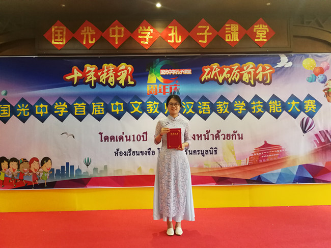 2018年9月10正值中國的教師節(jié),泰國國光中學孔子課堂舉辦了特殊的慶?;顒印皣庵袑W首屆中文教師漢語教學技能大賽”,希望在這個特殊的日子里讓老師能夠以賽促教,以賽促學,能夠更好的發(fā)展對外漢語教學。我校漢語國際教育專業(yè)17級在讀碩士、漢語國際教師志愿者黨杏丹同學在此次活動中榮獲三等獎。