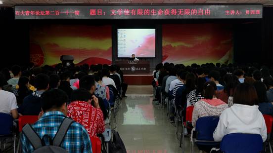 為進一步開展好第二屆“書香校園”建設(shè)活動,由校團委主辦,化學(xué)化工學(xué)院承辦的第211期石大青年論壇之“書香校園”建設(shè)主題報告于2018年4月17日晚19:00在鄠邑校區(qū)騰輝活動中心舉行。報告特邀柳青文學(xué)獎獲得者、陜西青年作家貝西西主講,學(xué)院黨委副書記劉小波、校團委老師周宇、學(xué)院2017級輔導(dǎo)員楊夢琳及390余名同學(xué)聆聽報告。