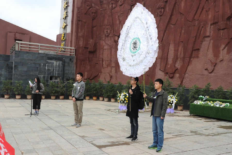 商管類1702班唐穎作為代表致悼詞。她說到,矗立在大家面前的烈士豐碑,訴說著英雄們光榮而無悔的事業(yè),歲月的風(fēng)塵早已在它身上刻下斑駁的印記,讓大家無法不回想起那段滄桑沉重的往事。七百余位革命烈士長眠于此。他們?yōu)樽非缶葒让竦恼胬頀侇^顱,灑熱血;為中華民族的解放事業(yè)前仆后繼,視死如歸。作為新時(shí)代的莘莘學(xué)子,更應(yīng)充滿愛國之情,樹立報(bào)國之心,努力學(xué)習(xí),繼承先烈遺志,為家鄉(xiāng)的建設(shè)、為祖國的富強(qiáng)而努力奮斗。