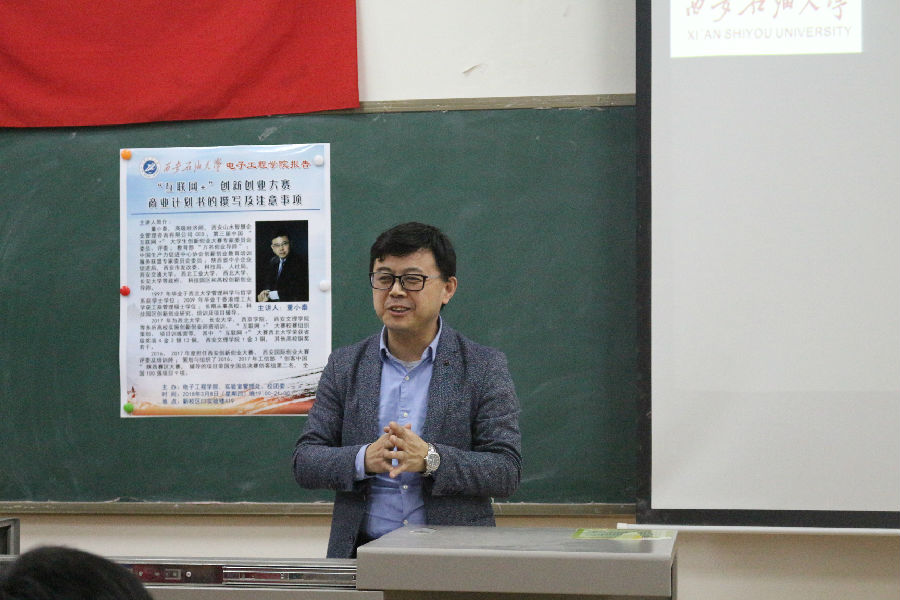 3月8日晚19點,電子工程學(xué)院在鄠邑校區(qū)C3實驗樓419教室成功舉辦了題為《商業(yè)計劃書的撰寫及注意事項》的專題講座。此次講座邀請到高級經(jīng)濟師、山水智慧企業(yè)管理咨詢有限公司CEO董小泰老師擔(dān)任主講。電子工程學(xué)院黨委副書記黃建禮、2016級輔導(dǎo)員梁琦、青年教師顏謹?shù)戎笇?dǎo)老師以及申報“互聯(lián)網(wǎng)+”創(chuàng)新創(chuàng)業(yè)項目的同學(xué)參加此次專題講座。