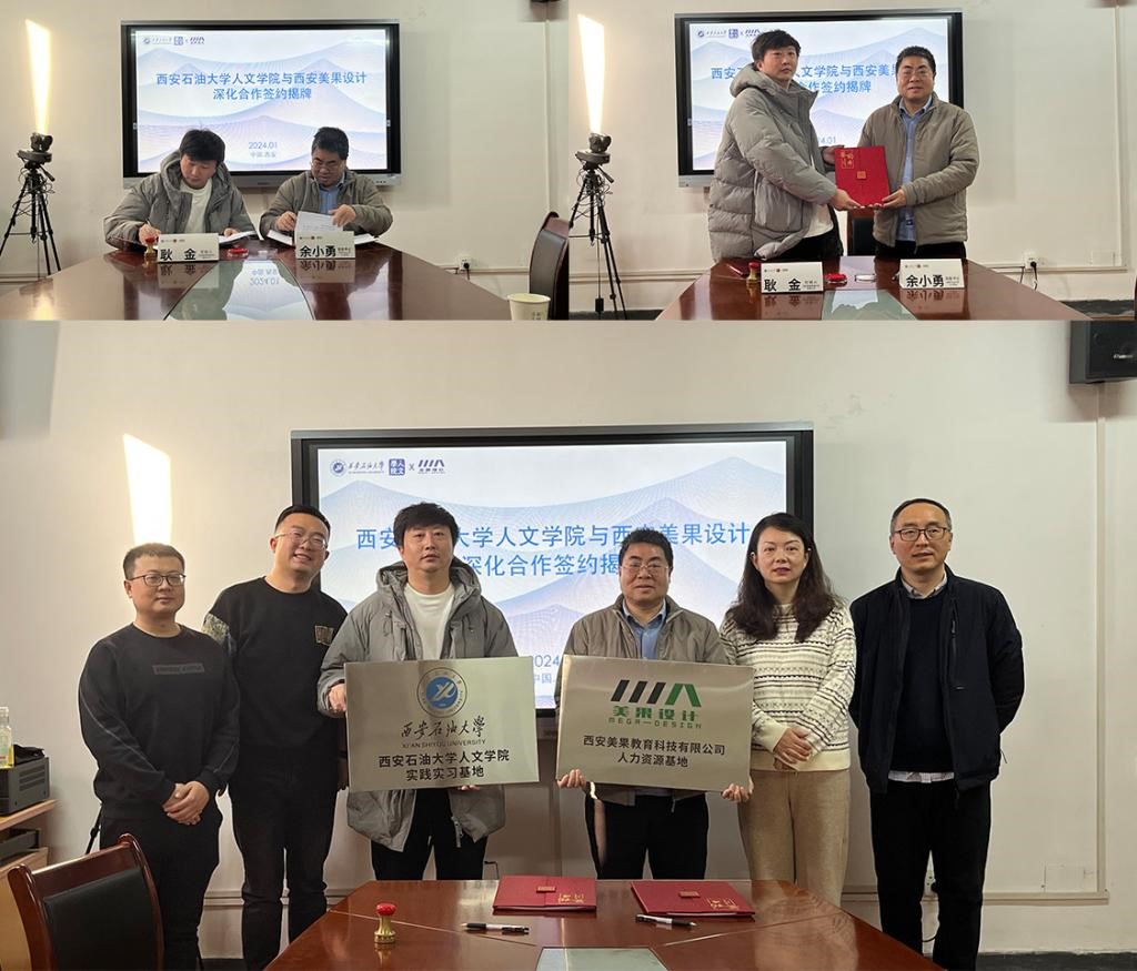 1月11日上午,人文學院與西安美果設計三年多來基于優(yōu)質(zhì)且有成效的合作,在西安石油大學雁塔校區(qū)一號教學樓813人文學院會議室,舉行了人文學院與西安美果設計校企深化產(chǎn)學研合作與掛牌儀式。人文學院黨委書記余小勇、黨委副書記盛丹、設計系主任曹盼宮、學工辦主任付強與西安美果設計創(chuàng)始人耿金、市場總監(jiān)李永東、品牌總監(jiān)牛奔等出席簽約儀式。會議由盛丹副書記主持。
