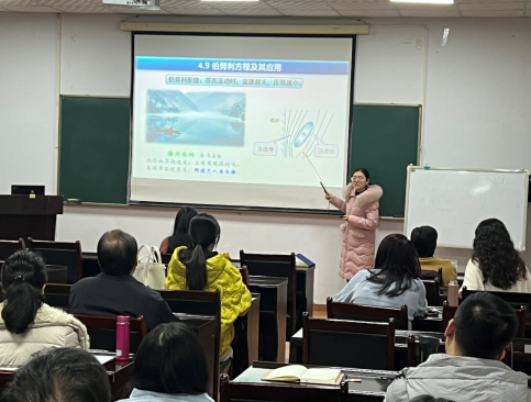 接著,化工機械系老師唐春麗為全體老師講授“工程流體力學(xué)”課程思政示范課。唐春麗將民航事故、工程經(jīng)驗和古詩詞融入教學(xué)中,通過15分鐘“深入淺出”的講解,將伯努利方程的物理意義完美的呈現(xiàn)在“聽眾”眼前。唐老師精湛的授課技藝獲得了老師們由衷的贊嘆。