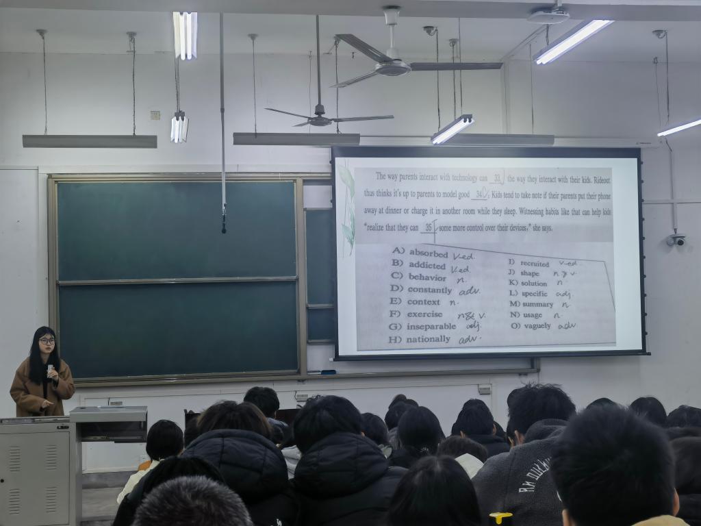 為增強(qiáng)大一學(xué)生對(duì)英語(yǔ)學(xué)習(xí)的重視程度,不斷完善學(xué)院的學(xué)業(yè)指導(dǎo)體系,學(xué)院2023級(jí)英語(yǔ)四級(jí)動(dòng)員會(huì)在邑校區(qū)A114室舉行。會(huì)上,盧筱佳以新能源行業(yè)的就業(yè)形勢(shì)和當(dāng)前畢業(yè)生就業(yè)困境為切入點(diǎn),結(jié)合學(xué)院往屆畢業(yè)生的求職案例,強(qiáng)調(diào)了通過(guò)英語(yǔ)四級(jí)的重要性和必要性,鼓勵(lì)同學(xué)們要樹(shù)立信心、主動(dòng)規(guī)劃、認(rèn)真準(zhǔn)備,在新學(xué)期里要持續(xù)加強(qiáng)英語(yǔ)課程的學(xué)習(xí)。同時(shí),盧筱佳介紹了學(xué)院晚自習(xí)英語(yǔ)加強(qiáng)訓(xùn)練和學(xué)院四級(jí)模擬考試的相關(guān)安排,建議同學(xué)們要珍惜每一次機(jī)會(huì),利用好周圍資源,熟悉四級(jí)考試流程,感受考場(chǎng)氛圍,掌握考試時(shí)間分配,及時(shí)解決學(xué)習(xí)困惑。隨后,能材2202班王茜雯從試卷結(jié)構(gòu)、備考經(jīng)驗(yàn)、應(yīng)試技巧、APP/網(wǎng)課推薦等方面進(jìn)行了分享,并針對(duì)同學(xué)們的提問(wèn)進(jìn)行了耐心細(xì)致的解答。能科2201班戴傳裕分享了自己的四級(jí)學(xué)習(xí)經(jīng)驗(yàn),從興趣到愛(ài)好,從單詞積累到聽(tīng)力培養(yǎng),最后到高分通過(guò)英語(yǔ)四級(jí)并取得聽(tīng)力滿分的成績(jī),詳細(xì)交流了自己的學(xué)習(xí)體會(huì)。