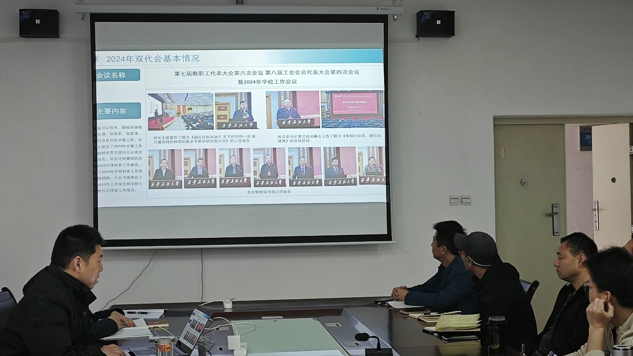 李慶本首先介紹了近期我校召開(kāi)的“雙代會(huì)”暨2024年學(xué)校工作會(huì)議相關(guān)精神及內(nèi)容。帶領(lǐng)全體教職工學(xué)習(xí)了校黨委書記常江同志所作的題為《爭(zhēng)做行動(dòng)派,跑出加速度》總結(jié)講話精神,以及校長(zhǎng)王進(jìn)富同志所作的題為《錨定目標(biāo)加油干,實(shí)干擔(dān)當(dāng)創(chuàng)一流,奮力建設(shè)特色鮮明的高水平教學(xué)研究型大學(xué)》工作報(bào)告,回顧了學(xué)校2023年的重點(diǎn)工作和主要成績(jī),詳細(xì)解讀了學(xué)校2024年主要工作目標(biāo)、任務(wù)和工作要求。