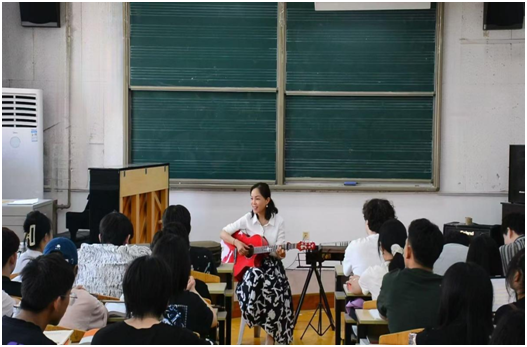 12周教學(xué)任務(wù)很快結(jié)束。5月15日是結(jié)課的日子,5月14日晚廖老師左手小指受傷,一彈琴就鉆心疼痛。為了兌現(xiàn)與同學(xué)們的約定,廖老師決定不改計(jì)劃,在課堂上向同學(xué)們展示學(xué)習(xí)不滿三個(gè)月的新技能——吉他彈唱給同學(xué)們聽。