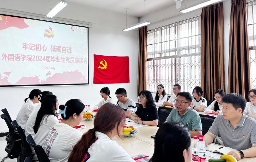 6月7日上午,外國語學院在鄠邑校區(qū)崇文樓召開2024屆畢業(yè)生黨員代表座談會。學院黨委書記田虹霞、副書記王業(yè)青、學生工作辦公室主任周宇、輔導員陳浩及2024屆畢業(yè)生黨員代表參加座談會。會議由學院黨委副書記王業(yè)青主持。