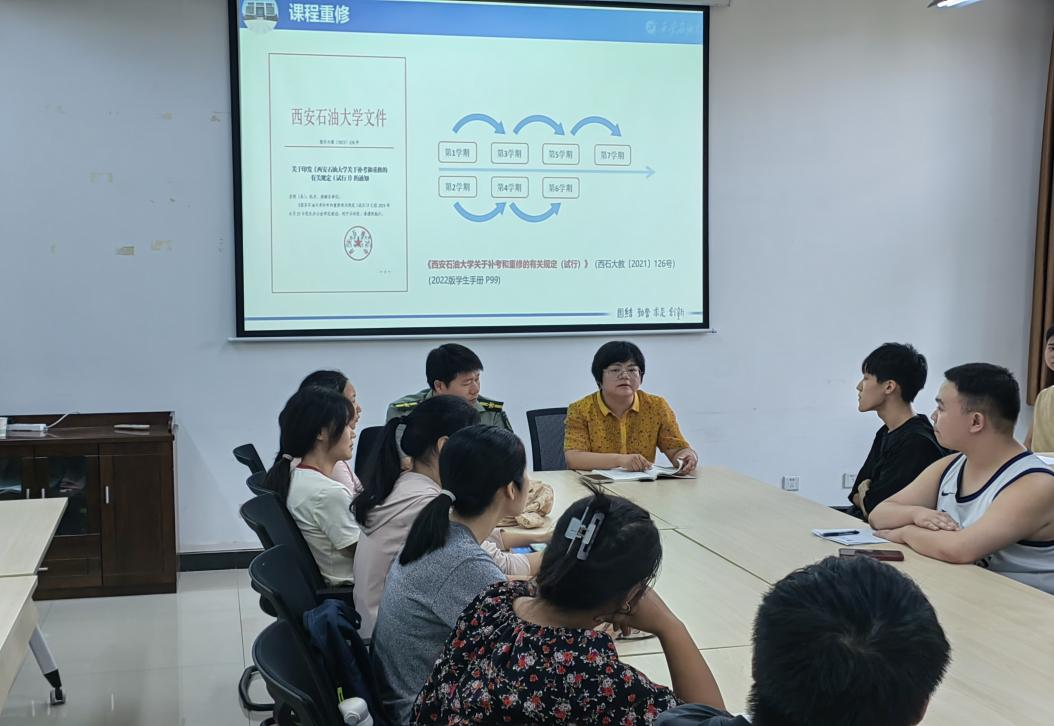 會(huì)上,尹老師以《西安石油大學(xué)關(guān)于補(bǔ)考和重修的有關(guān)規(guī)定(試行)》(西石大教〔2021〕126號(hào))為切入點(diǎn),詳細(xì)講解了學(xué)籍異動(dòng)學(xué)生關(guān)心的各類課程問(wèn)題;同時(shí)從學(xué)籍管理角度,再次提醒21級(jí)準(zhǔn)畢業(yè)生核對(duì)個(gè)人課程和成績(jī),尤其要對(duì)公共課加強(qiáng)查漏補(bǔ)缺,鼓勵(lì)他們第7學(xué)期課程務(wù)必好好學(xué)習(xí)全部通過(guò)。