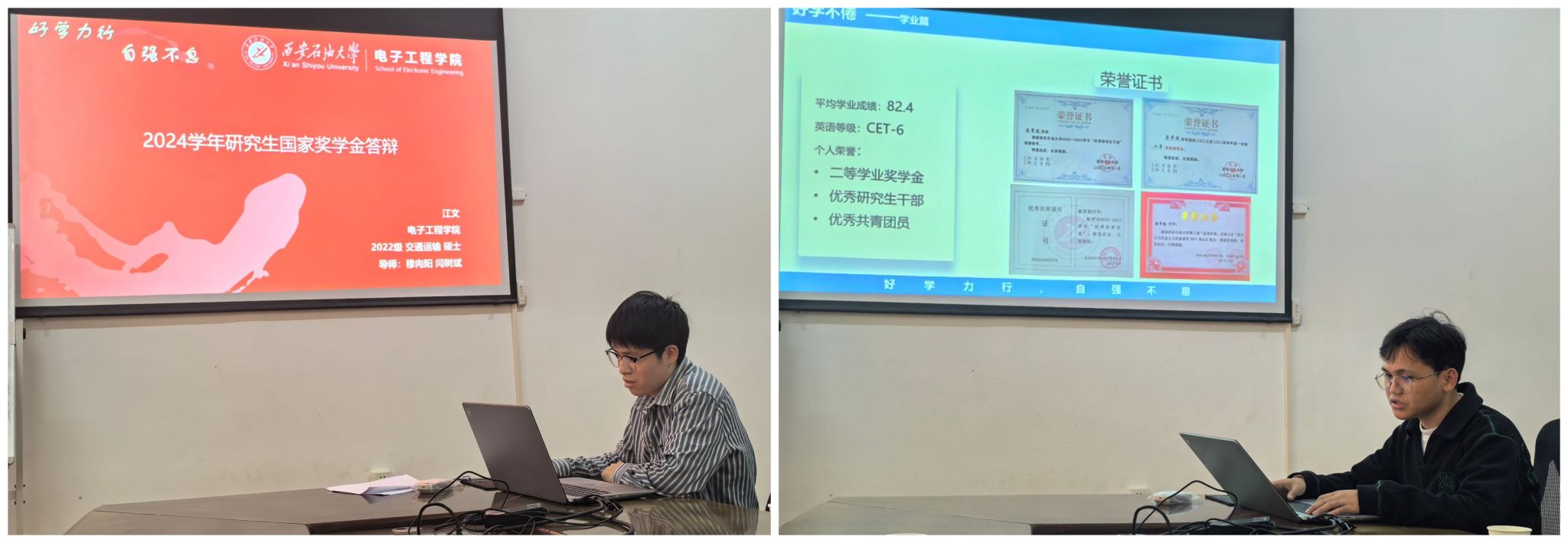 會(huì)議伊始,楊一宣讀了關(guān)于學(xué)校獎(jiǎng)學(xué)金評(píng)審工作的相關(guān)文件內(nèi)容以及學(xué)院獎(jiǎng)學(xué)金評(píng)審細(xì)則,分別介紹了國(guó)家獎(jiǎng)學(xué)金和中石油獎(jiǎng)學(xué)金評(píng)審要求,明晰了此次獎(jiǎng)學(xué)金評(píng)審的答辯規(guī)則。經(jīng)前期學(xué)生本人申請(qǐng)、資格審核、成果量化等環(huán)節(jié),候選人依次從思想道德、學(xué)業(yè)成績(jī)、學(xué)科競(jìng)賽、科研成果、社會(huì)實(shí)踐、志愿活動(dòng)等方面進(jìn)行了匯報(bào),就評(píng)委老師的提問作出了回應(yīng)。最終確定張坤等7名同學(xué)為電子工程學(xué)院2024年研究生國(guó)家獎(jiǎng)學(xué)金擬推薦人選,荊夢(mèng)怡等2名同學(xué)為中石油獎(jiǎng)學(xué)金擬推薦人選并進(jìn)行公示。