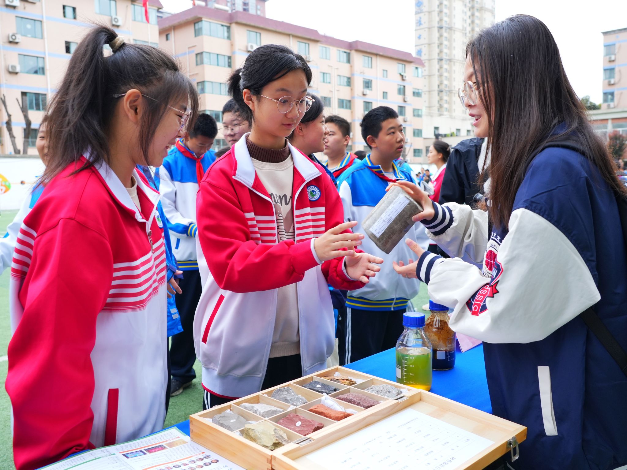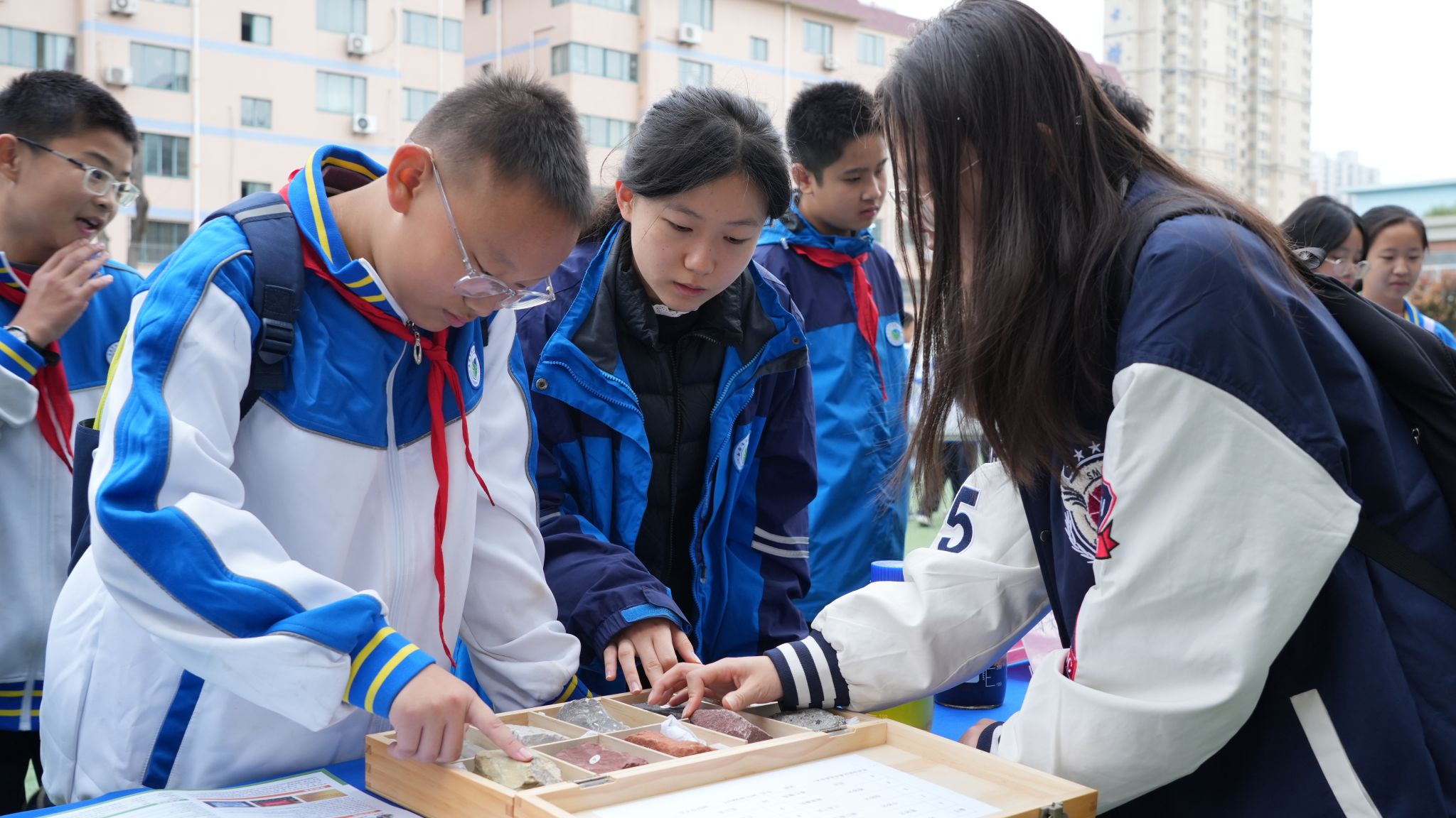 活動現(xiàn)場,科普志愿者正在向同學(xué)們講解巖石標(biāo)本