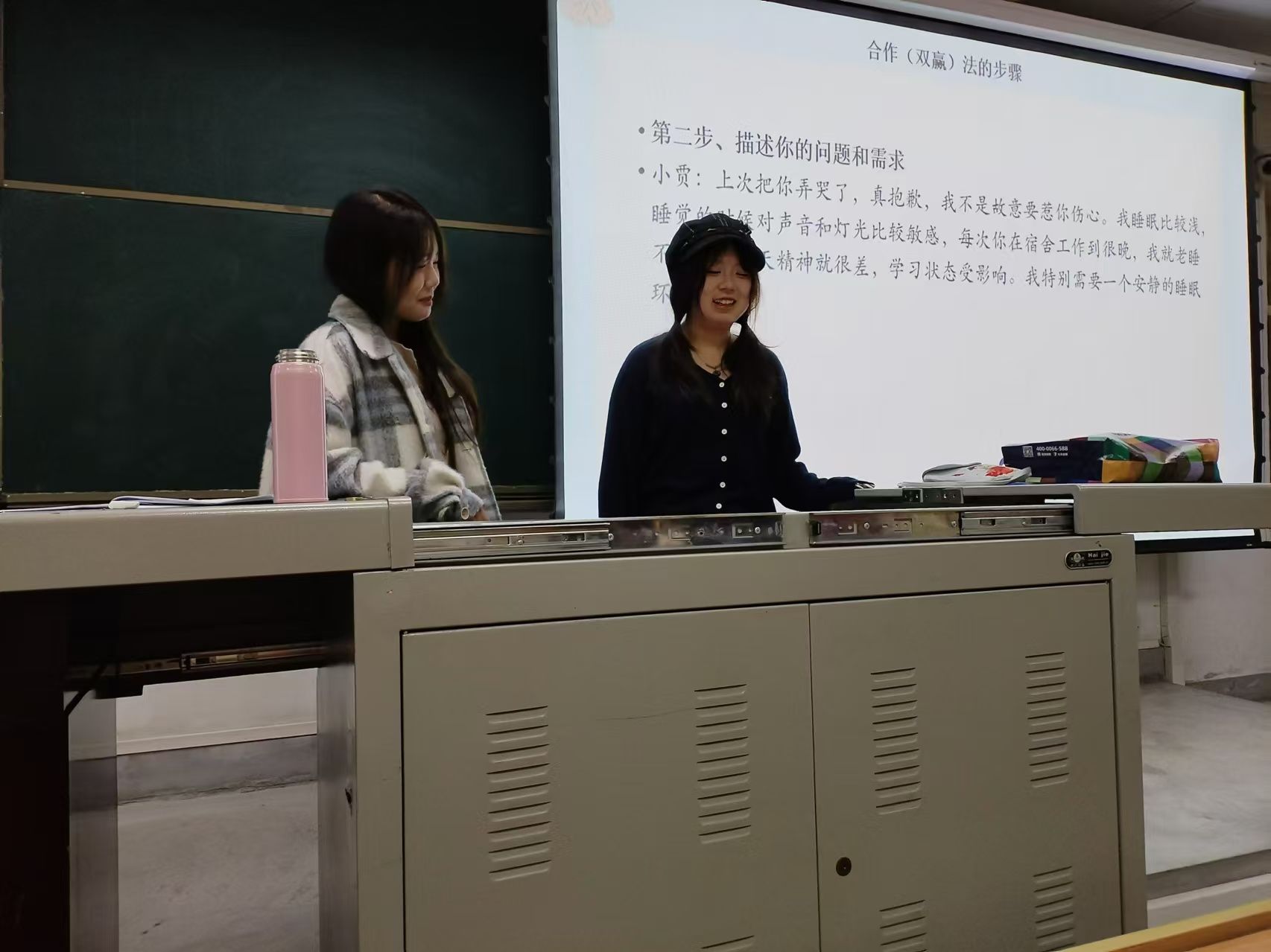 最后,趙老師從心理學(xué)的角度介紹了“知覺(jué)檢核”、“枕頭法”以及“合作(雙贏)法”三種應(yīng)對(duì)宿舍人際關(guān)系沖突的實(shí)用溝通策略,通過(guò)情景模擬幫助同學(xué)們更好地理解使用這些方法,并提出要辯證地對(duì)待沖突,及時(shí)發(fā)現(xiàn)問(wèn)題并主動(dòng)溝通,以平和冷靜的態(tài)度解決宿舍矛盾,維護(hù)宿舍和諧。