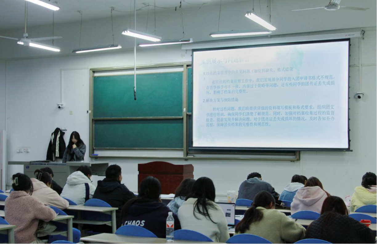 11月20日,人文學(xué)院團(tuán)委學(xué)生會組織部部長郭雨涵帶來了“團(tuán)務(wù)工作實(shí)務(wù)”主題講座,2024級全體團(tuán)支書、輔導(dǎo)員助理以及組織部干事參加。本次講座圍繞著團(tuán)務(wù)工作的實(shí)際操作展開,為大學(xué)生團(tuán)干部講解了具體的基礎(chǔ)團(tuán)務(wù)工作操作方法與智慧團(tuán)建的使用說明。在講座中,郭雨涵列舉了日常工作可能面臨的問題,并且給出了解決方法,她強(qiáng)調(diào),在收集資料的時(shí)候確保內(nèi)容和數(shù)量正確是至關(guān)重要的。對于智慧團(tuán)建這一網(wǎng)絡(luò)系統(tǒng),她表示,智慧團(tuán)建是現(xiàn)代團(tuán)務(wù)工作的重要信息化平臺,也是各位團(tuán)干部展開團(tuán)務(wù)工作的重要網(wǎng)絡(luò)陣地,各位團(tuán)干部需要牢牢掌握系統(tǒng)的使用方法,運(yùn)用網(wǎng)絡(luò)工具更好地服務(wù)同學(xué)。