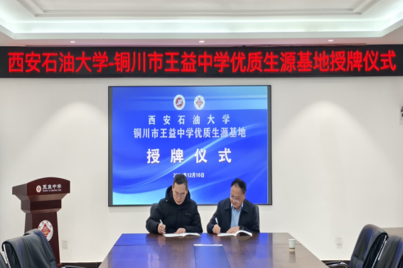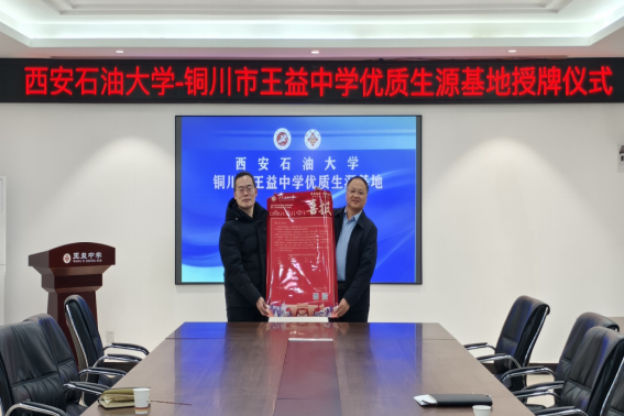 會上,張建高代表學校與銅川王益中學簽署了《西安石油大學優(yōu)秀生源基地建設協(xié)議》,授予“優(yōu)秀生源基地”牌匾,贈送錄取喜報。