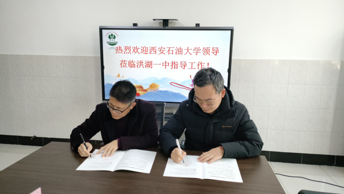 在洪湖市,學(xué)校一行與洪湖市第一中學(xué)副校長(zhǎng)戴裕明等領(lǐng)導(dǎo)進(jìn)行座談。雙方介紹了各自的辦學(xué)歷史、辦學(xué)規(guī)模、辦學(xué)特色,并就繼續(xù)開展更為深入的合作進(jìn)行深入交流。張建高代表學(xué)校與洪湖市第一中學(xué)領(lǐng)導(dǎo)共同簽署《西安石油大學(xué)優(yōu)秀生源基地建設(shè)協(xié)議》,授予“優(yōu)秀生源基地”牌匾并贈(zèng)送了錄取喜報(bào)。