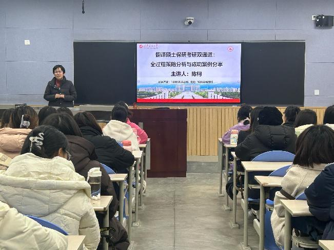 12月24日上午,外國語學(xué)院在鄠邑校區(qū)博覽樓A219啟動2026屆考研動員系列講座,本次邀請學(xué)院MTI翻譯碩士教學(xué)中心陳柯教授面向翻譯專業(yè)學(xué)生開展專題講座,學(xué)院60余名學(xué)生參加。
