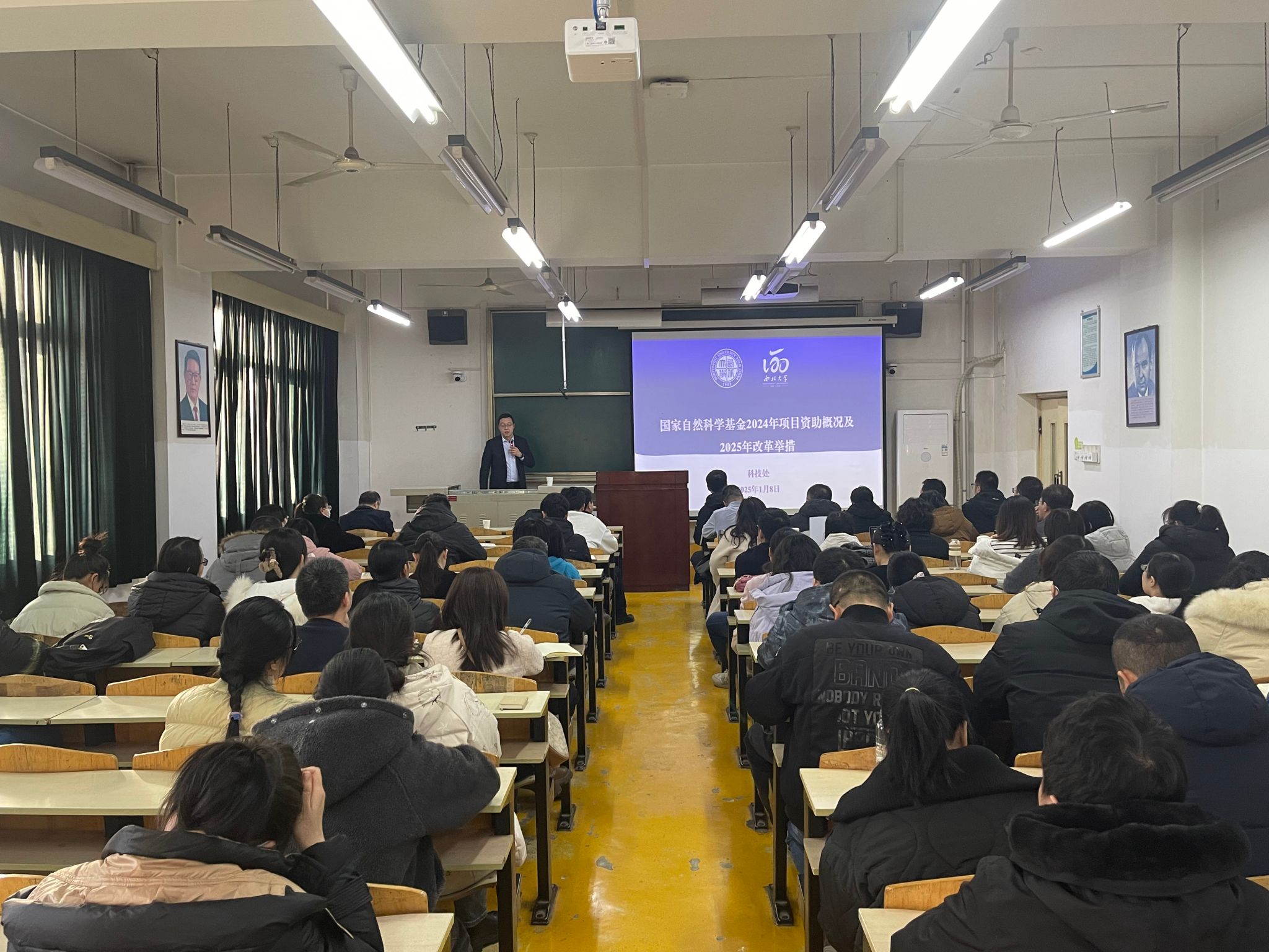 為持續(xù)做好2025年度國家自然科學基金申報工作,進一步提升國家基金申報質(zhì)量,繼續(xù)推動有組織科研工作,1月14日下午,西北大學科學技術處處長、現(xiàn)代物理研究所楊濤教授應邀在我校第二教學樓1107室作了題為“國家自然科學基金2024年項目資助概況及2025年改革舉措”的報告??蒲刑幦w成員、各院科研副院長、科研辦公室主任(秘書)、教師代表等100余人參加報告會。會議由科研處處長張益主持。