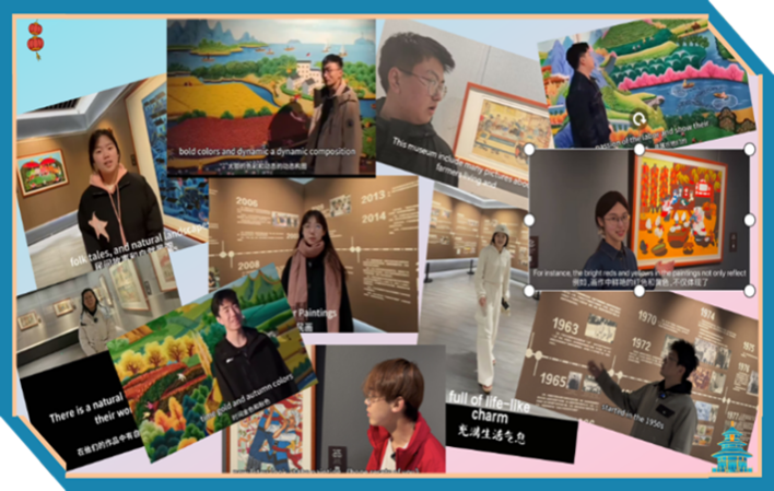 鄠邑農(nóng)民畫作為國家級非物質(zhì)文化遺產(chǎn),以原生態(tài)的鄉(xiāng)土題材、明快的色彩語言和質(zhì)樸的美學(xué)風(fēng)格蜚聲海內(nèi)外?;顒右潦?,學(xué)生通過鄠邑區(qū)農(nóng)民畫博物館專業(yè)講解員的講解和視頻觀看,系統(tǒng)學(xué)習(xí)了農(nóng)民畫六十余年的發(fā)展歷程,深刻理解了鄠邑農(nóng)民畫作品中蘊含的關(guān)中民俗、節(jié)慶文化與農(nóng)耕智慧。在隨后的實踐環(huán)節(jié)中,學(xué)生以小組為單位,結(jié)合英語語言優(yōu)勢與新媒體技術(shù)展開創(chuàng)作,進(jìn)行英文講解以及視頻拍攝工作。為了提升視頻質(zhì)量,活動開展前,除了對英文腳本反復(fù)修改,很多學(xué)生還自學(xué)了一些攝影技術(shù)并進(jìn)行分鏡腳本設(shè)計?;顒蝇F(xiàn)場,學(xué)生手持設(shè)備,穿梭于展廳進(jìn)行多角度講解拍攝。