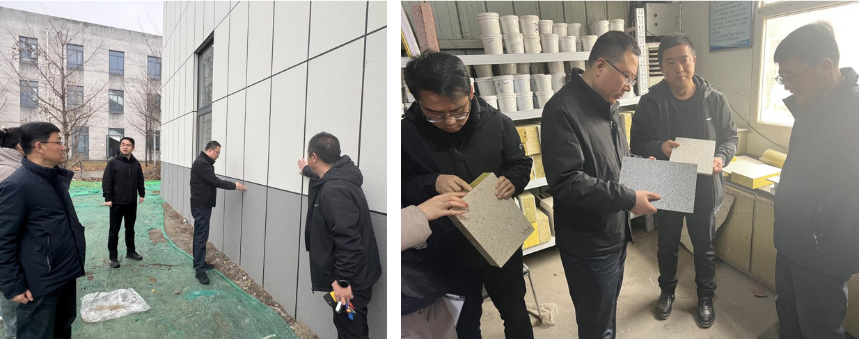 在保溫一體板產(chǎn)品廠家及施工現(xiàn)場(chǎng),基建處一行進(jìn)入廠區(qū),仔細(xì)觀察保溫一體板的色澤、紋理,觸摸其表面質(zhì)感,查看板材的厚度,并于廠家就保溫性能、安裝工藝、在校園建筑中的適用性、耐用性、美觀性等方面進(jìn)行了探討。
