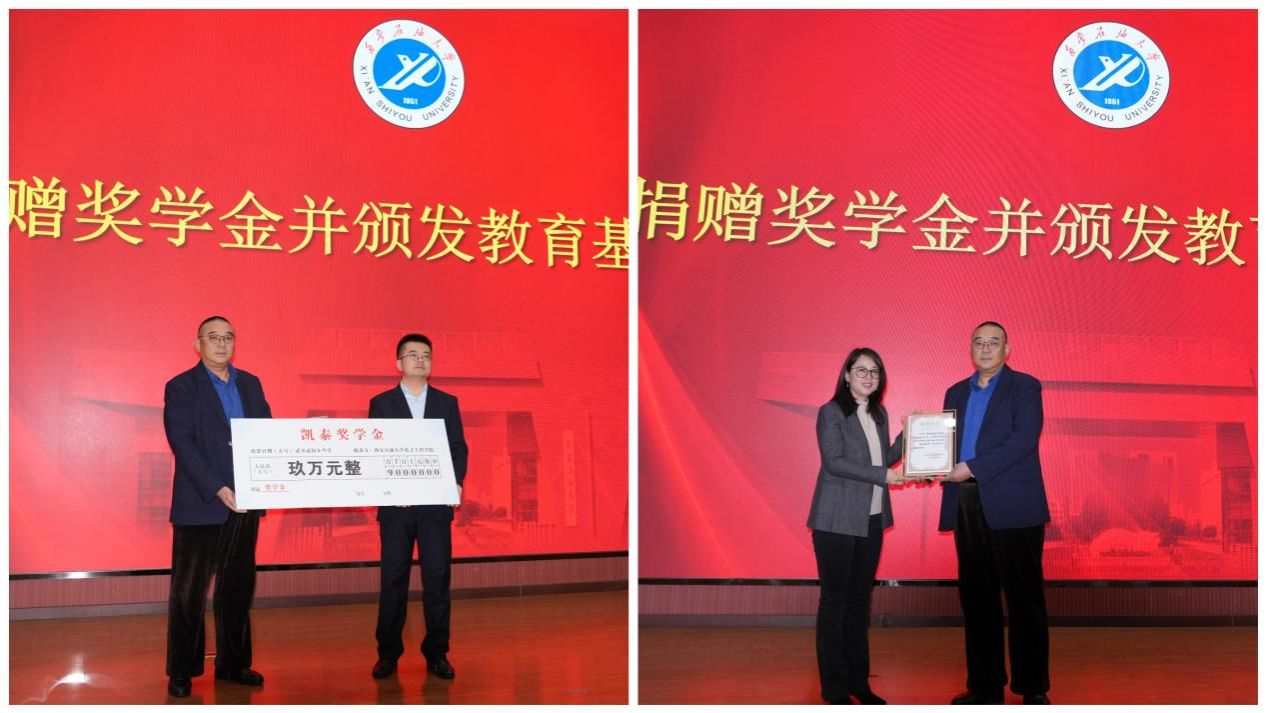 會前,趙健副校長與吳立中董事長進行了深入交流,對企業(yè)近年來取得的蓬勃發(fā)展表示祝賀,對企業(yè)支持教育事業(yè)發(fā)展的善舉表示感謝。雙方表示要進一步鞏固校企友誼,加強溝通與合作,推動校企雙方共同發(fā)展。儀式開始,凱泰石油機械有限公司董事長吳立中向?qū)W?;饡栀浟私逃?,潘娜向吳立中頒發(fā)了教育基金捐贈證書。