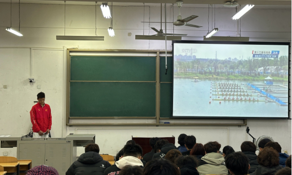 報告會上,茍毅飛首先介紹了舉辦本次報告會的目的,一是讓廣大學(xué)生了解賽艇運動知識,熟悉賽艇運動文化,并由此愛上賽艇運動;二是通過選拔的方式,組建學(xué)校賽艇運動隊,并通過專業(yè)訓(xùn)練,能在各類賽艇比賽中獲得佳績,為學(xué)校爭得榮譽。