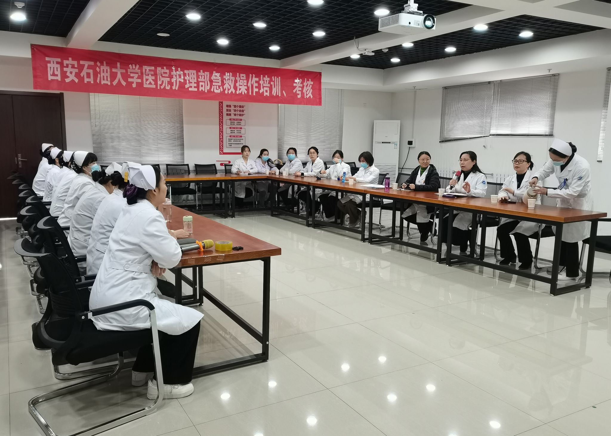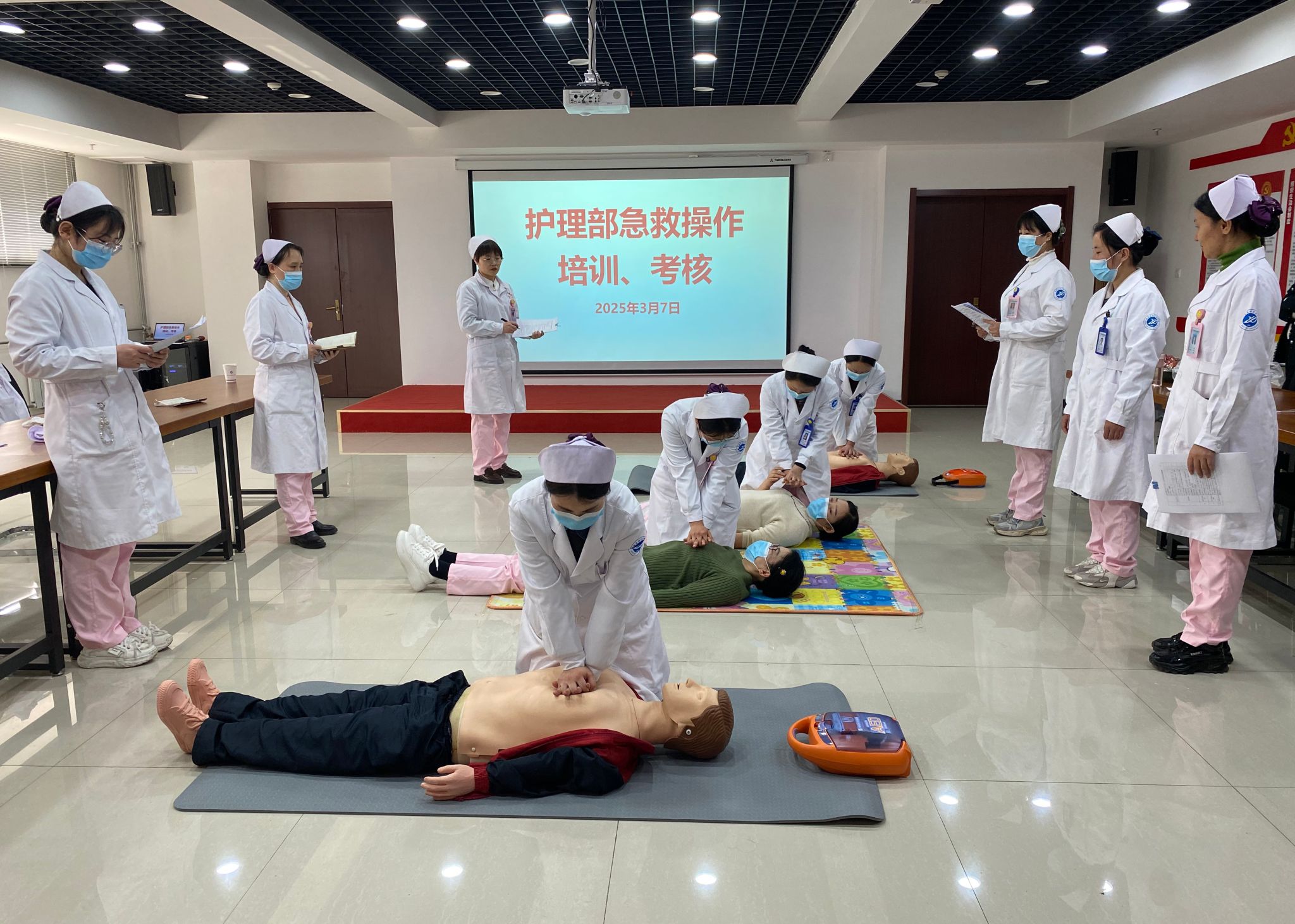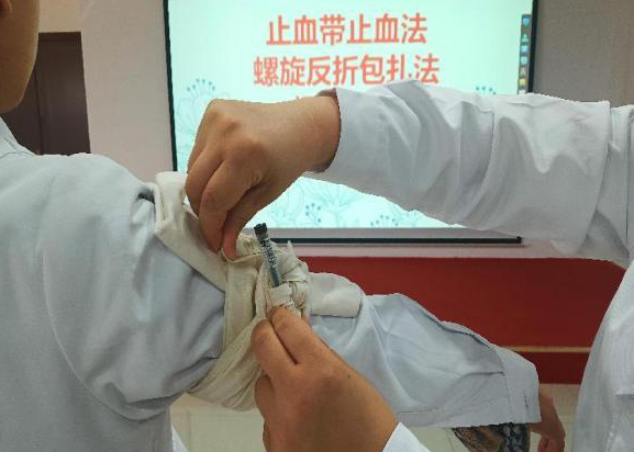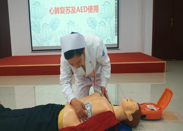 此次培訓講師為獲得陜西省紅十字救護師資的主管護師解姣,她詳細講解了心肺復蘇技術(CPR)、自動體外除顫儀(AED)的使用、海姆立克急救法、急救包扎技術等常見急救技術理論知識,并進行了現(xiàn)場操作示教。