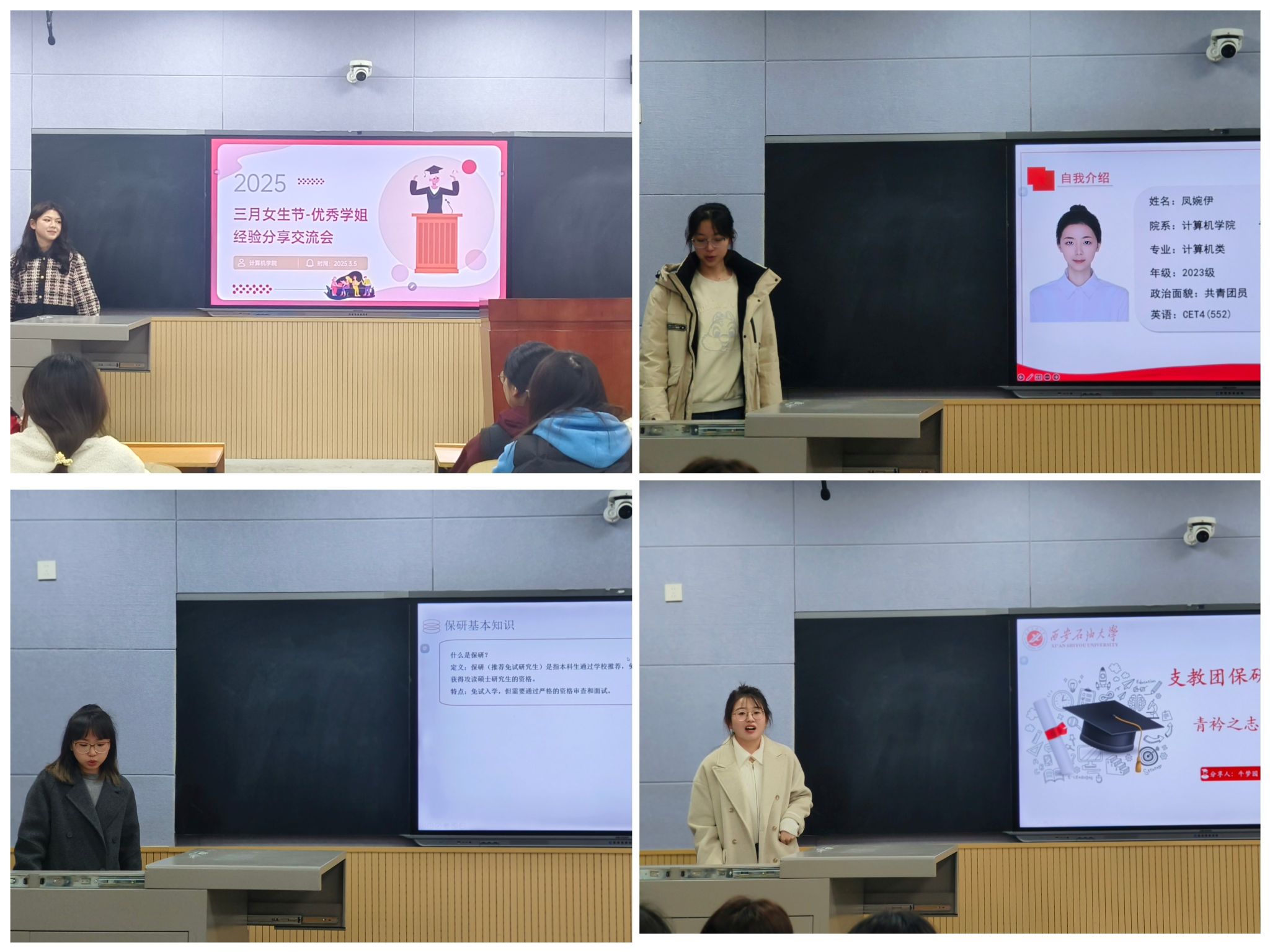 在優(yōu)秀學(xué)姐經(jīng)驗分享活動中,學(xué)院邀請了多位優(yōu)秀的在校生代表,分享她們在學(xué)業(yè)、科研、實習(xí)以及生活中的經(jīng)驗與心得。這些優(yōu)秀榜樣從不同角度講述了她們?nèi)绾纹胶鈱W(xué)習(xí)與生活、如何面對挑戰(zhàn)與壓力,以及如何在計算機領(lǐng)域中找到自己的方向。