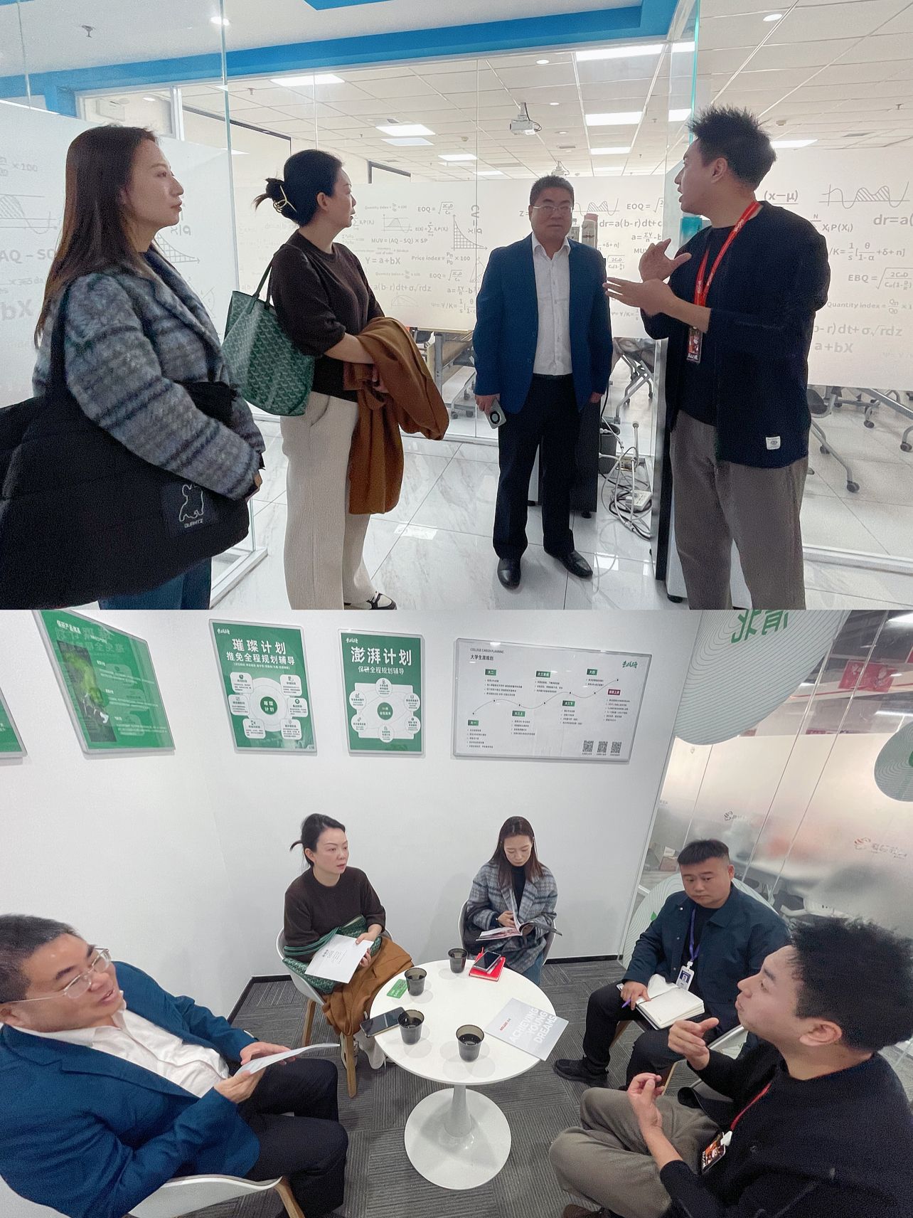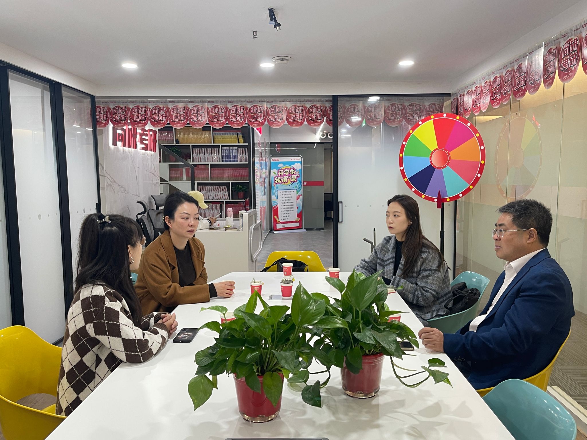 隨后,學(xué)院一行來到尚研考研,雙方圍繞四六級成績提升、考研輔導(dǎo)、考公能力培養(yǎng)等議題展開深入探討。盛丹闡述了人文學(xué)院學(xué)生在考研、升學(xué)、考公等領(lǐng)域的多元需求。尚研考研負(fù)責(zé)人劉老師詳細(xì)介紹了機(jī)構(gòu)的特色課程體系與服務(wù)優(yōu)勢,提出了“四六級專項(xiàng)提升+考研全流程規(guī)劃”的初步合作方案,并表示將優(yōu)先保障人文學(xué)院學(xué)生的公益課程資源。