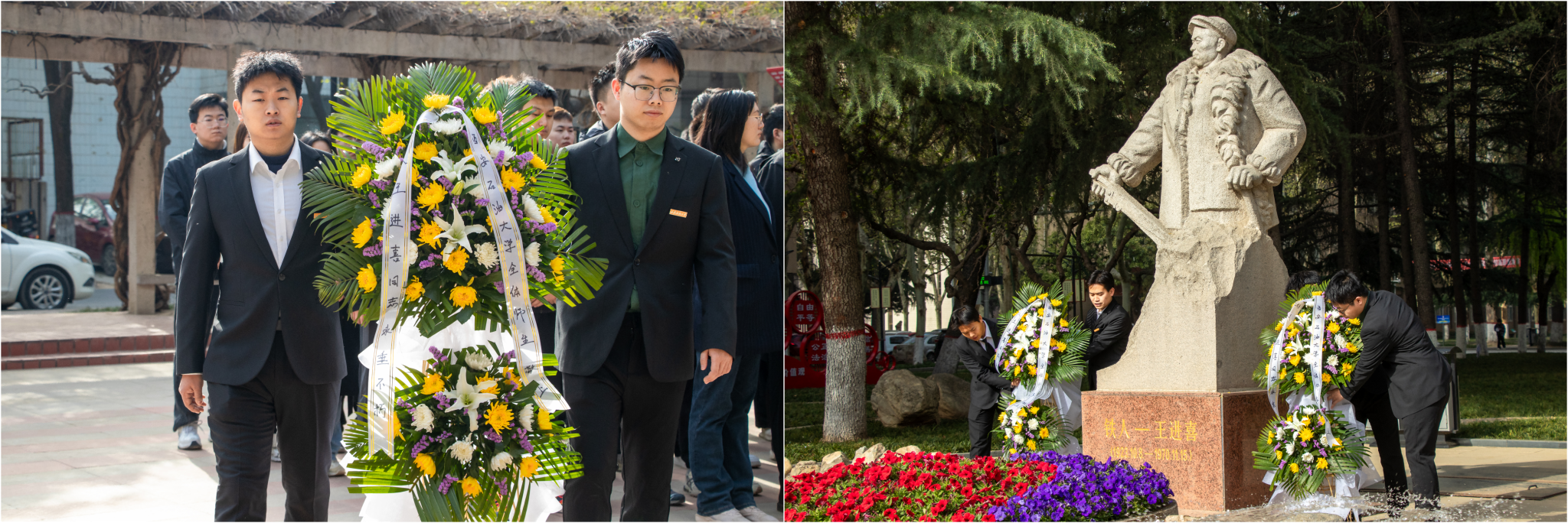 晨光中,鐵人塑像巍峨矗立,寄托著無盡追思。研究生代表緩步上前,將寄托著師生敬意的花籃敬獻于雕像前,與會師生向鐵人王進喜塑像三鞠躬,表達對鐵人王進喜的緬懷和崇敬之情。