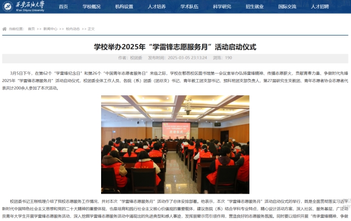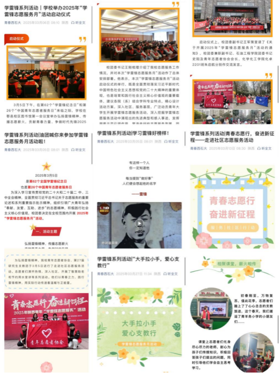 校團委結合我校實際,印發(fā)《關于開展2025年“學雷鋒志愿服務月”活動的通知》(西石大團發(fā)〔2025〕3號)。一是廣泛開展,扎實推進。統(tǒng)一組織學校各級團組織集中開展為期一個月的“學雷鋒”志愿服務活動,活動范圍覆蓋文明校園、社區(qū)服務、關愛留守兒童、鄉(xiāng)村振興、助殘助老、美麗中國等志愿服務活動,樹立新時代雷鋒精神榜樣,引領新時期志愿服務風尚;二是高度重視,科學謀劃。各院(系)團委高度重視,精心組織,統(tǒng)籌協(xié)調,團委書記、團支部書記認真學習習近平總書記對深入開展學雷鋒活動的重要指示批示精神,結合各院(系)實際情況,精心設計活動方案,開展特色志愿服務活動,做好組織協(xié)調和統(tǒng)籌推動工作,做到分工明確,責任到人;三是注重時效,打造品牌。有效整合志愿服務資源,開展形式多樣、內(nèi)容豐富的志愿服務活動,打造學雷鋒志愿服務品牌項目,通過開展學雷鋒志愿服務活動,讓廣大青年在志愿服務活動中經(jīng)受鍛煉、增長才干、有所收獲,讓學雷鋒志愿服務融入日常、化作經(jīng)常。