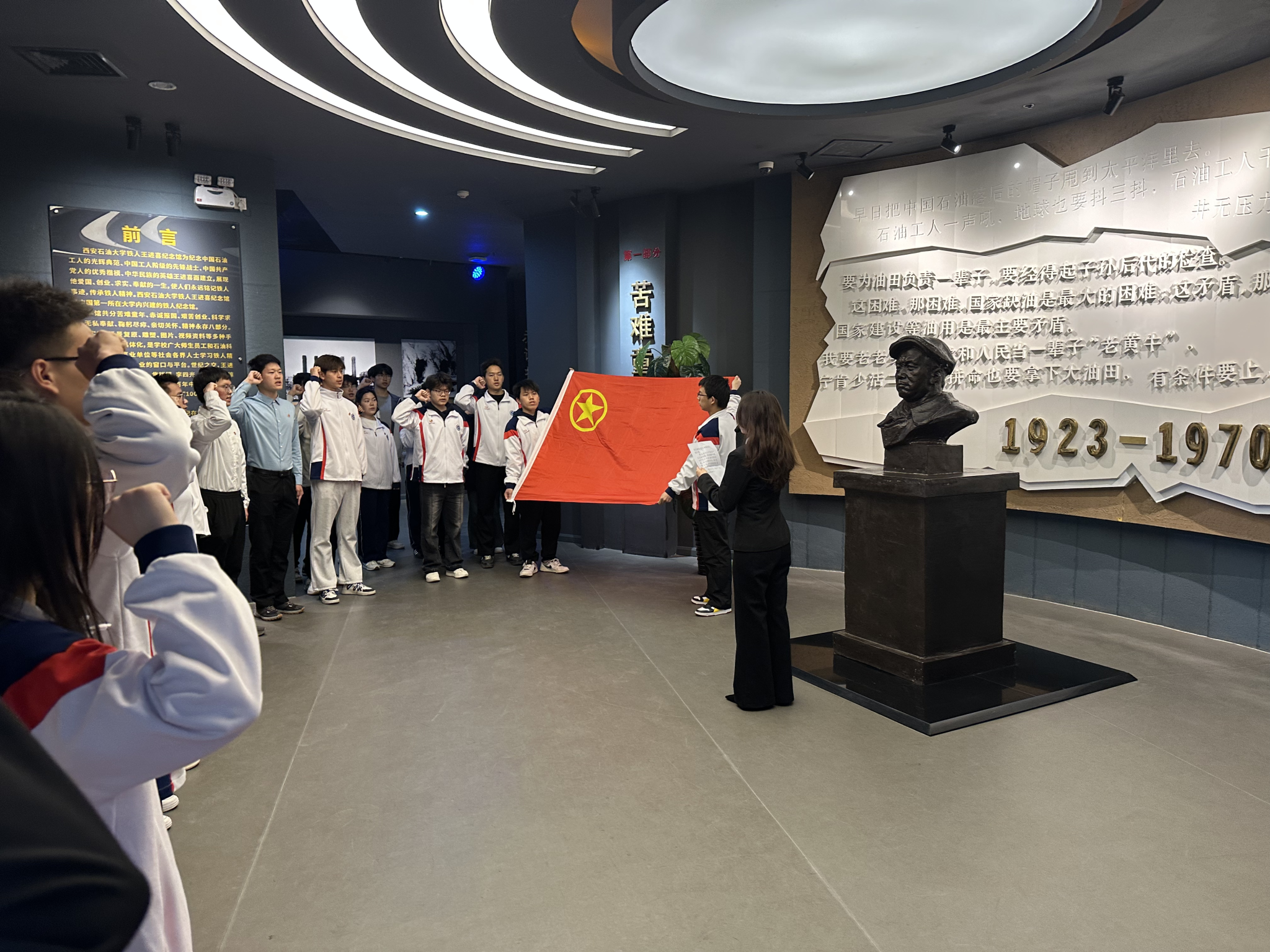 參觀結束后,大家在鐵人塑像前莊嚴列隊,面向團旗重溫入團誓詞。鏗鏘有力的誓言回蕩在紀念館內,展現了青年學子傳承先烈遺志、勇擔時代使命的決心。