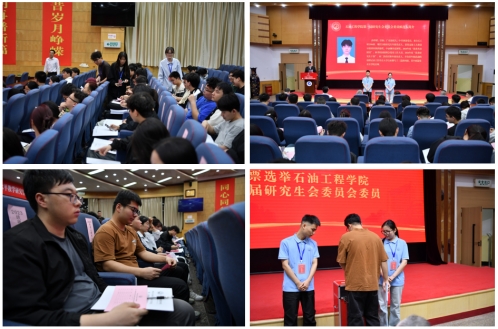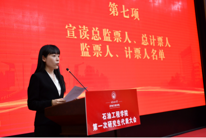 石油工程學(xué)院黨委組織員宋興淼向大會作籌備工作報告;學(xué)生工作辦公室主任史陽宣讀第一次研究生代表大會選舉辦法;博士研究生輔導(dǎo)員余靚豪宣讀總監(jiān)票人、總計票人、監(jiān)票人、計票人名單。