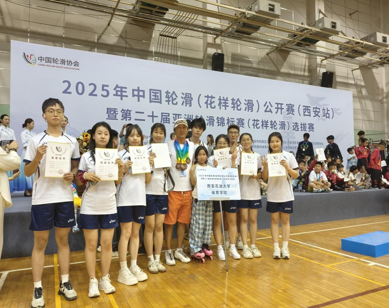 5月2日,2025年中國輪滑(花樣輪滑)公開賽(西安站)暨第二十屆亞洲輪滑錦標賽(花樣輪滑)選拔賽在閻良文化體育中心開賽,共有來自陜西、上海、廣州、湖北、吉林等地的20支輪滑隊、140余名選手參賽。本次比賽,我校體育學院院長李壽邦擔任領(lǐng)隊、校輪滑隊主教練陳亮擔任教練,帶領(lǐng)9名隊員參加了成年組團隊方陣輪滑的比賽。
