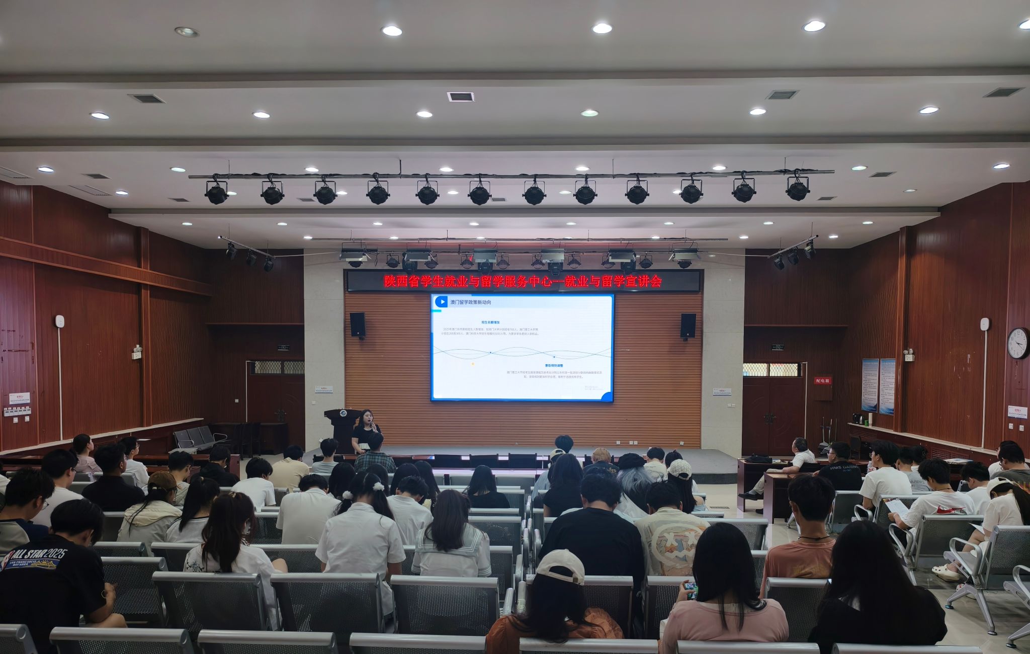 6月5日,學(xué)校就業(yè)創(chuàng)業(yè)指導(dǎo)中心聯(lián)合陜西省學(xué)生就業(yè)與留學(xué)服務(wù)中心在鄠邑校區(qū)崇文樓118報告廳舉辦就業(yè)留學(xué)政策宣講會,來自全校各年級的200余名學(xué)生參加活動。