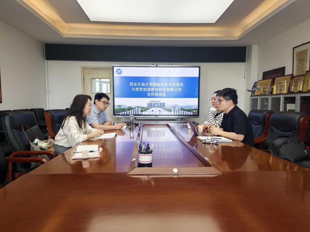 2025年6月6日上午,陜西梵思創(chuàng)途教育科技有限公司代表一行2人來(lái)校,在雁塔校區(qū)東方石油樓801開(kāi)展合作座談。會(huì)議由國(guó)際合作及交流處處長(zhǎng)董皓主持。