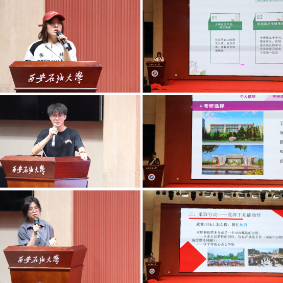 2021級優(yōu)秀學生代表金倩茹、榮崇、李亞菲依次做考研、就業(yè)經(jīng)驗分享。他們結(jié)合自身經(jīng)歷,從目標確立、時間規(guī)劃、復習策略、信息搜集、心態(tài)調(diào)整到簡歷制作、面試技巧、實習選擇、offer決策等多個維度,與同學們展開分享交流,為同學們提供實戰(zhàn)心得。