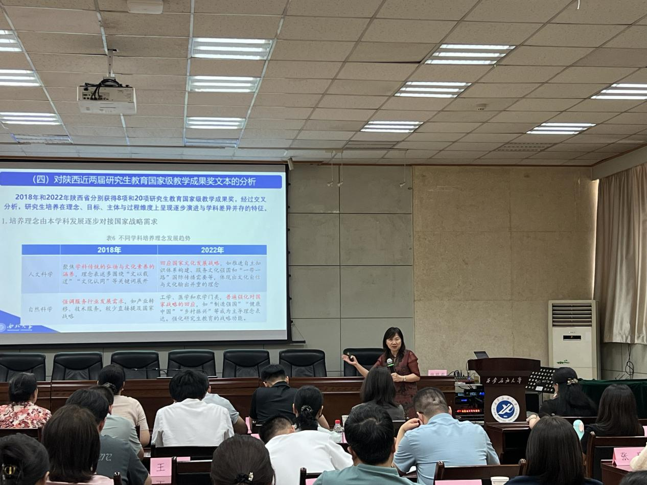 西北大學姚聰莉教授以《教學成果獎的詞云分析及成果培育》為題,首先從培養(yǎng)理念、目標、主體和過程四個視角,對前三屆國家級教學成果獎做了詞云分析,梳理出人才培養(yǎng)范式的基本特征和變化趨勢。進而圍繞教學成果獎的內(nèi)涵特征、培育路徑、申報書撰寫與成果凝練、申報注意事項等方面進行了系統(tǒng)講解。她強調(diào),教學成果應體現(xiàn)鮮明的時代特征、突出的問題導向與創(chuàng)新意識,同時應在理論高度、實踐基礎(chǔ)與應用成效上實現(xiàn)有機統(tǒng)一。成果培育要聚焦關(guān)鍵問題、破解改革難題,注重數(shù)據(jù)支撐和以學生為中心的成果提煉原則。并建議盡早謀劃,集結(jié)力量開展協(xié)同攻關(guān),整合資源、打造優(yōu)勢互補的團隊,實現(xiàn)科研反哺教學,推動高質(zhì)量成果產(chǎn)出。