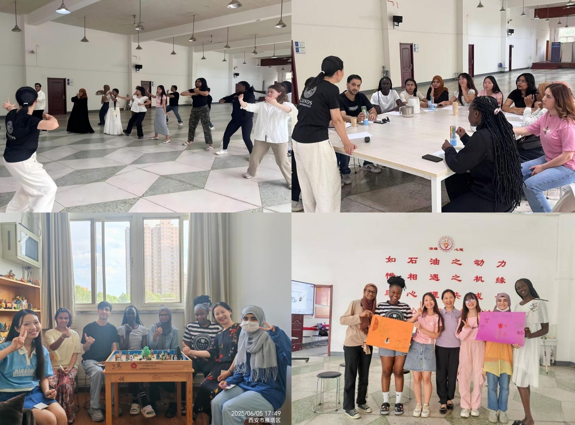 本期工作坊基于跨文化心理學(xué)相關(guān)理論,專為提升國(guó)際學(xué)生心理適應(yīng)能力而設(shè)計(jì)。活動(dòng)圍繞“相遇在西安石油大學(xué)”“積極心態(tài)的構(gòu)建”“適應(yīng)過(guò)程中的挫折與成長(zhǎng)”“期待與祝?!彼膫€(gè)主題開(kāi)展。每場(chǎng)工作坊均以中國(guó)傳統(tǒng)健身氣功八段錦開(kāi)場(chǎng)熱身,引導(dǎo)參與者分享個(gè)人文化背景與在校經(jīng)歷,并通過(guò)建立積極心態(tài)、尋求社會(huì)支持、實(shí)現(xiàn)自我成長(zhǎng)、共繪發(fā)展愿景等環(huán)節(jié)進(jìn)行敘事重構(gòu),切實(shí)提升國(guó)際學(xué)生的跨文化心理適應(yīng)能力。