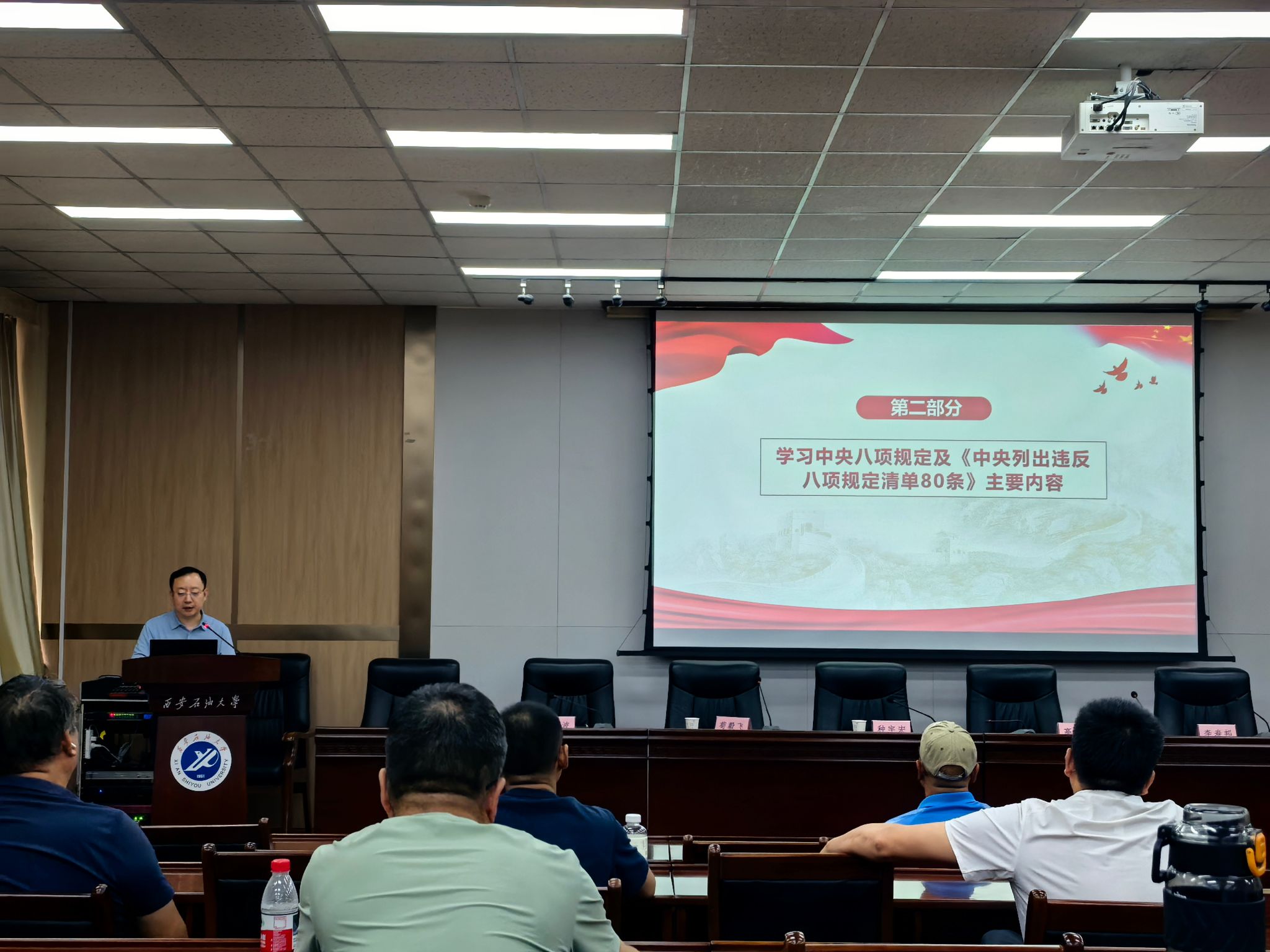 講授中,種宇宏首先帶領(lǐng)全體黨員回顧了中央八項(xiàng)規(guī)定的發(fā)展歷程,重溫了中央八項(xiàng)規(guī)定及《中央列出違反八項(xiàng)規(guī)定清單80條》主要內(nèi)容。進(jìn)而從持續(xù)糾治享樂(lè)主義、奢靡之風(fēng),堅(jiān)決防反彈回潮、防隱形變異、防疲勞厭戰(zhàn);重點(diǎn)糾治形式主義、官僚主義,確保黨中央重大決策部署落地見(jiàn)效;堅(jiān)持糾“四風(fēng)”樹(shù)新風(fēng)并舉,抓出自覺(jué)、形成習(xí)慣等三個(gè)方面,講述了如何持續(xù)落實(shí)中央八項(xiàng)規(guī)定精神,推進(jìn)作風(fēng)建設(shè)常態(tài)化長(zhǎng)效化。最后,從突出“轉(zhuǎn)”字,強(qiáng)化作風(fēng)鍛造;突出“嚴(yán)”字,強(qiáng)化紀(jì)律養(yǎng)成;突出“防”字,強(qiáng)化執(zhí)紀(jì)監(jiān)督等三個(gè)方面,講述了如何聚焦全面從嚴(yán)治黨,鑄強(qiáng)校園風(fēng)清氣正廉潔生態(tài)。本次專(zhuān)題黨課講授內(nèi)容豐富,重點(diǎn)突出,深入解讀了中央八項(xiàng)規(guī)定的核心要義與實(shí)踐要求,并結(jié)合新時(shí)代黨風(fēng)廉政建設(shè)新形勢(shì),引導(dǎo)黨員干部筑牢思想防線,將規(guī)定精神內(nèi)化于心、外化于行,切實(shí)以優(yōu)良作風(fēng)推動(dòng)工作高質(zhì)量發(fā)展。