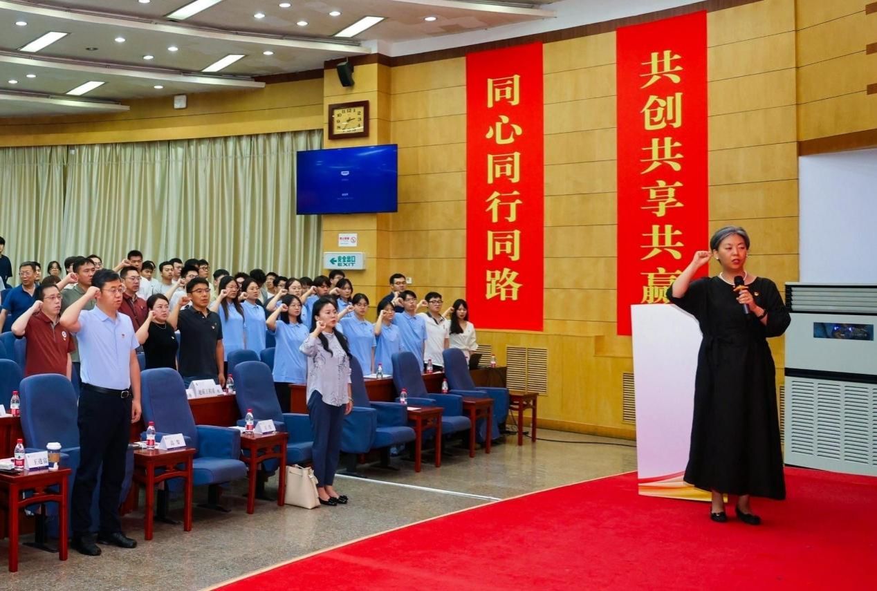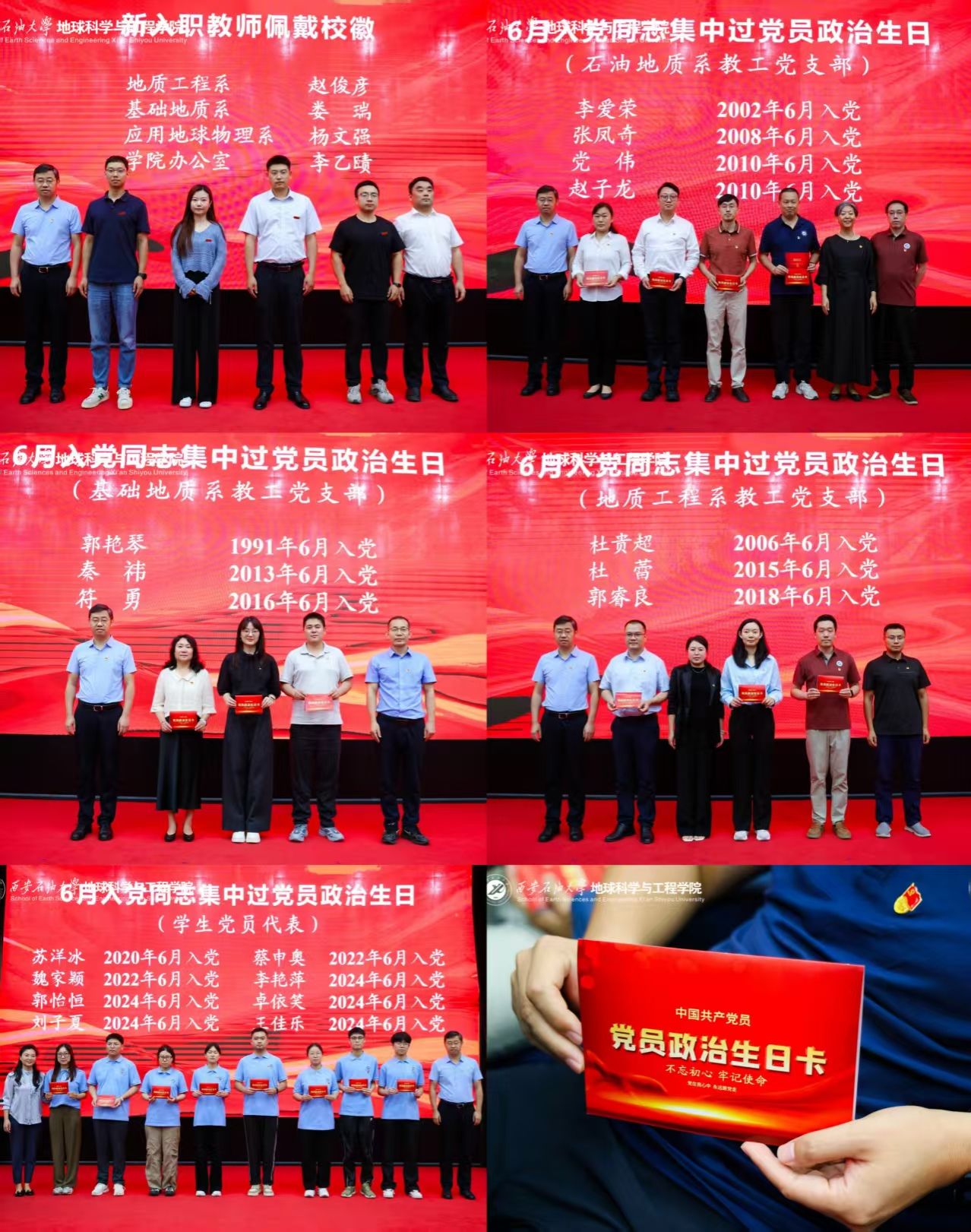 學(xué)院副院長沈鴻雁宣讀學(xué)院新入職教師名單。學(xué)院院長宋立軍等與會(huì)領(lǐng)導(dǎo)為新進(jìn)教師佩戴?;?,象征教育薪火相傳。在集中過政治生日環(huán)節(jié),校院領(lǐng)導(dǎo)與各系黨支部書記、主任為6月入黨的師生黨員代表頒發(fā)黨員政治生日卡,進(jìn)一步強(qiáng)化身份認(rèn)同,激發(fā)使命擔(dān)當(dāng)。