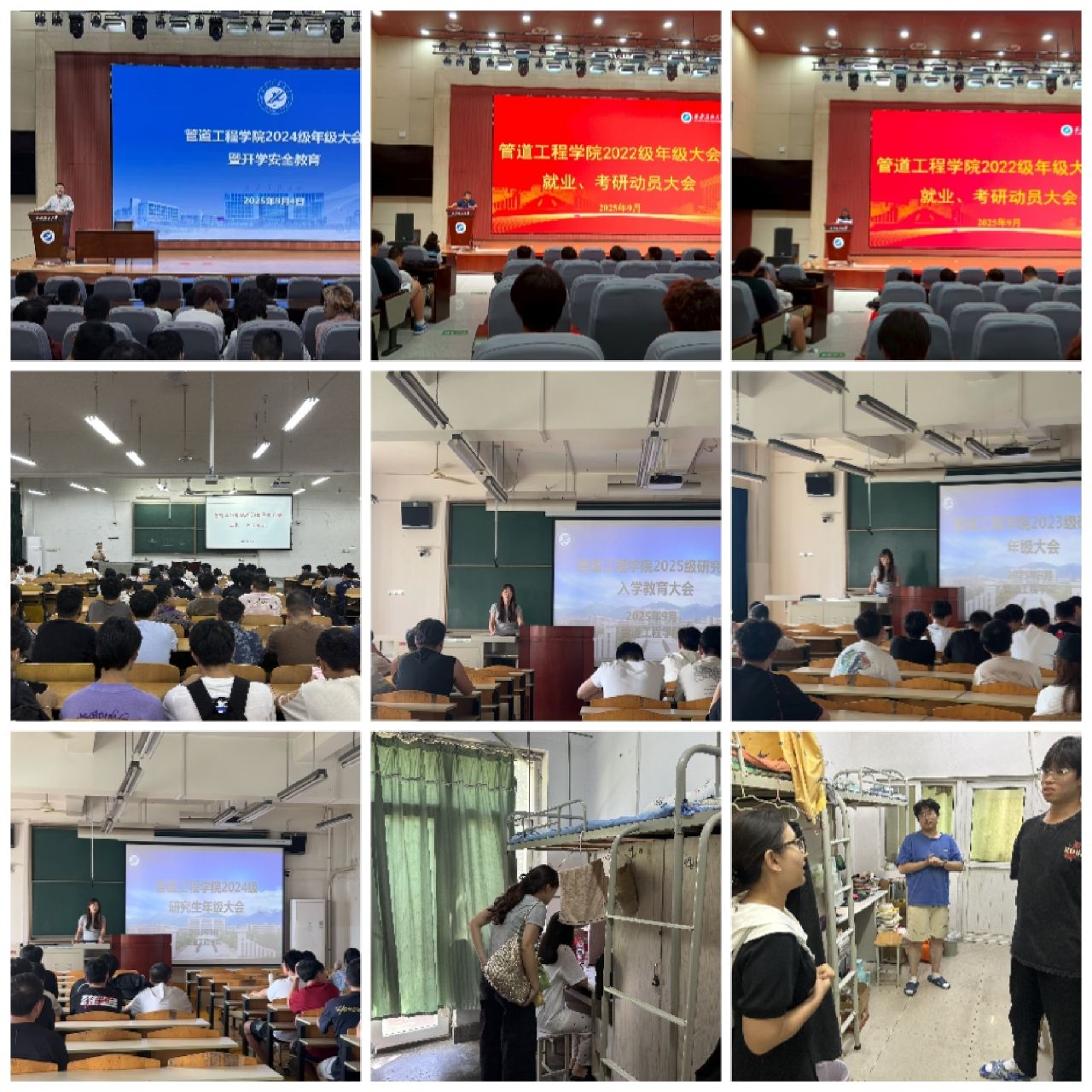 為確保新學(xué)期全院研究生、本科生在校期間的人身、財(cái)產(chǎn)安全,營(yíng)造安全、和諧的校園環(huán)境,開(kāi)學(xué)前期,學(xué)院成立了學(xué)生安全教育工作小組,并詳細(xì)制定了《管道工程學(xué)院2025-2026學(xué)年第一學(xué)期開(kāi)學(xué)學(xué)生安全教育工作方案》。9月1日至9月10日,學(xué)院研究生、本科生各年級(jí)均全面、系統(tǒng)地開(kāi)展了新學(xué)期開(kāi)學(xué)安全教育系列工作。